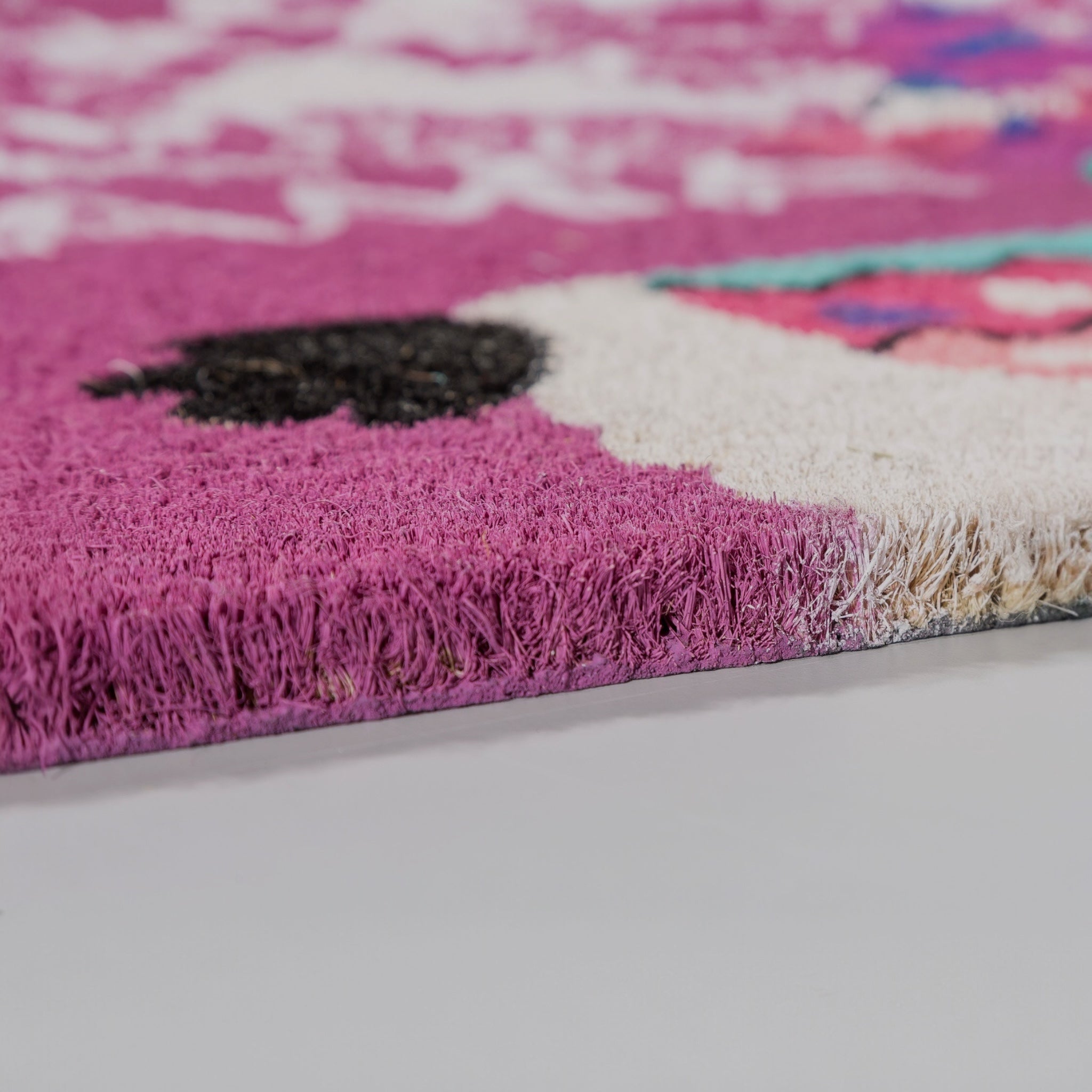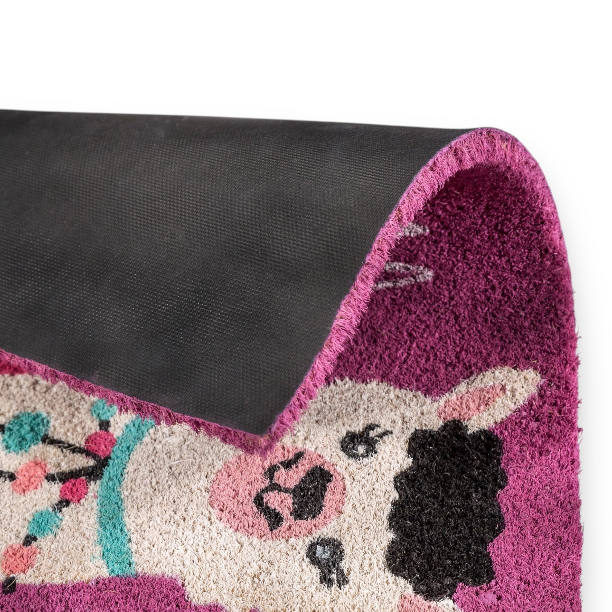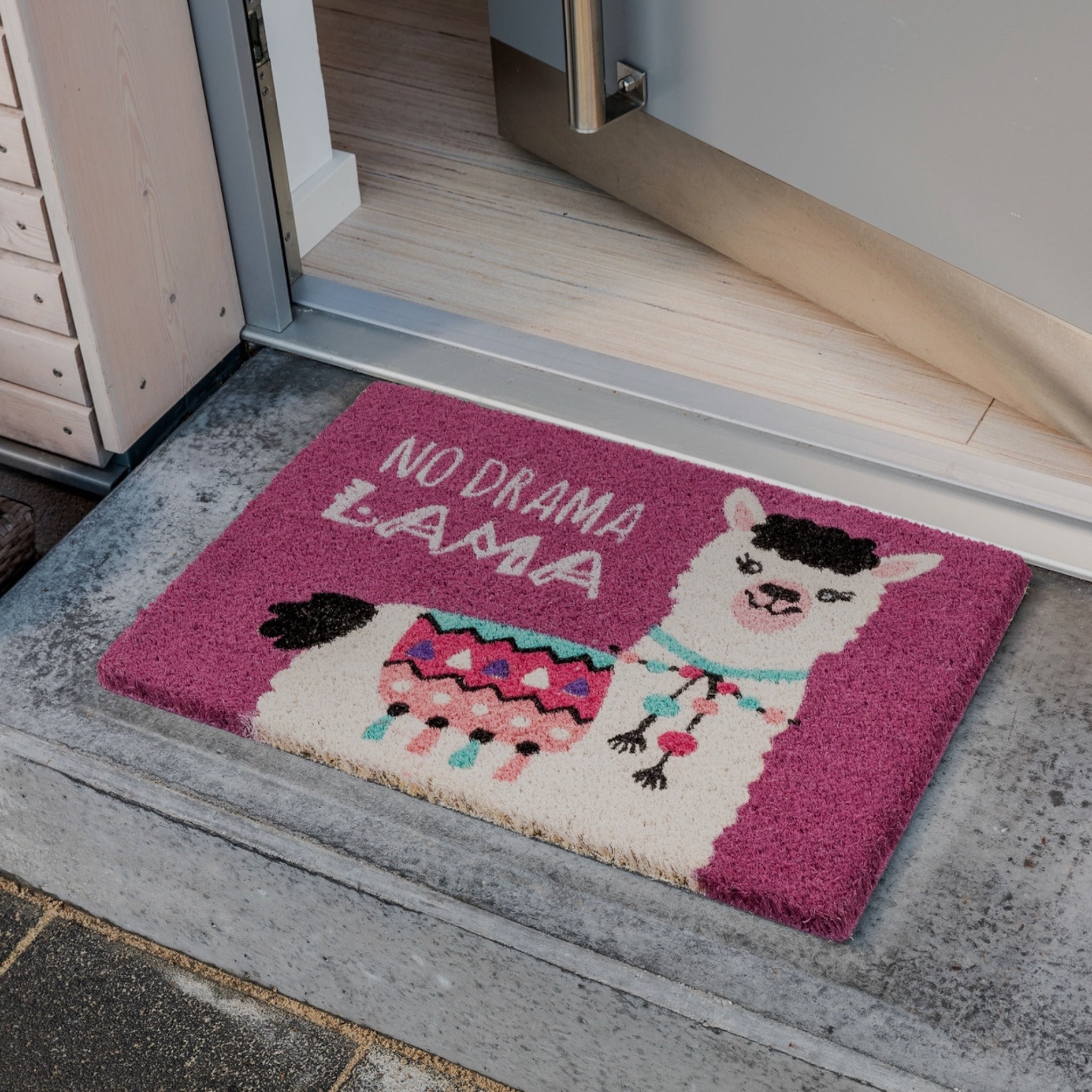 Questo zerbino da esterno è realizzato in fibra di cocco naturale antibatterica con fondo antiscivolo. Il disegno raffigura un simpatico lama con la scritta no drama lama