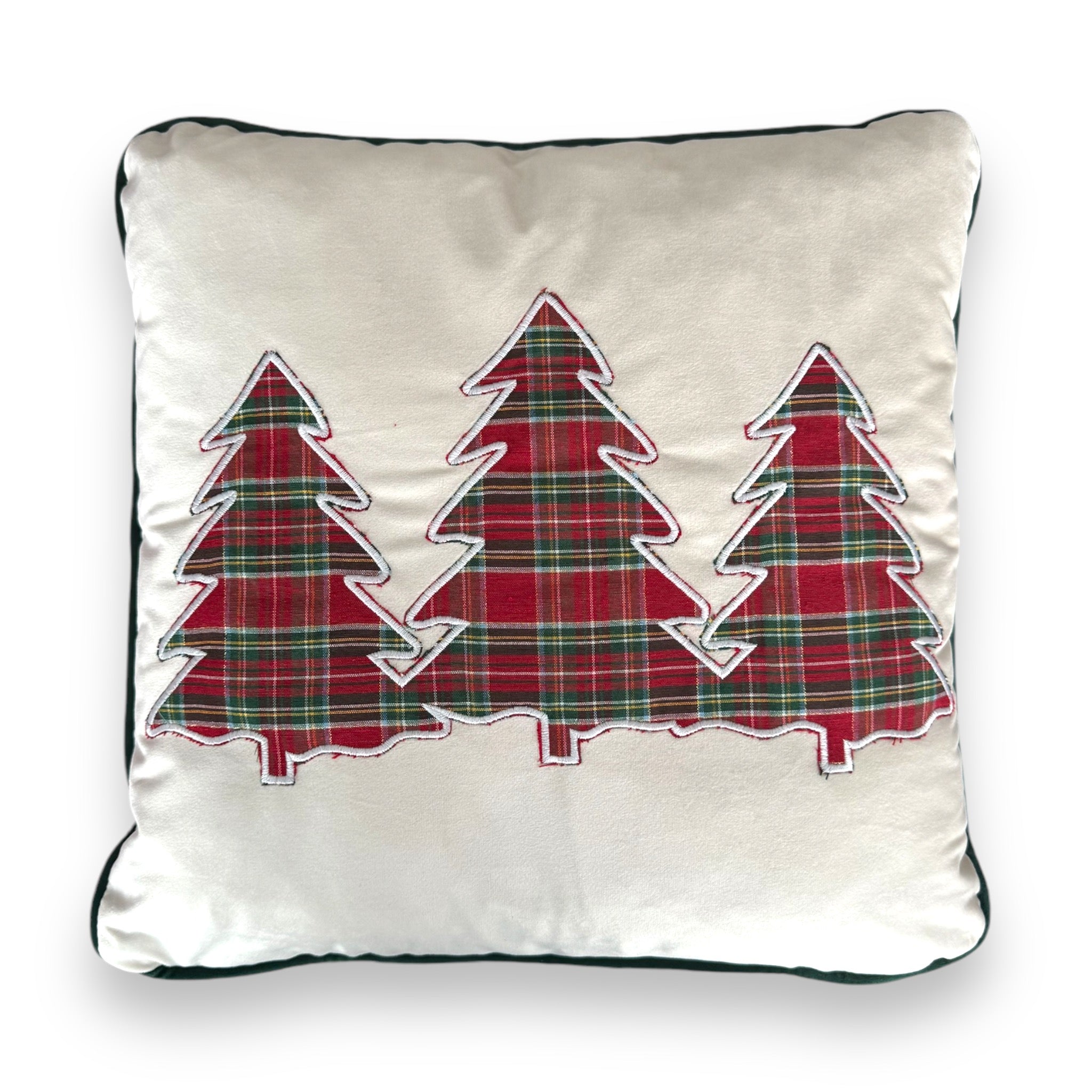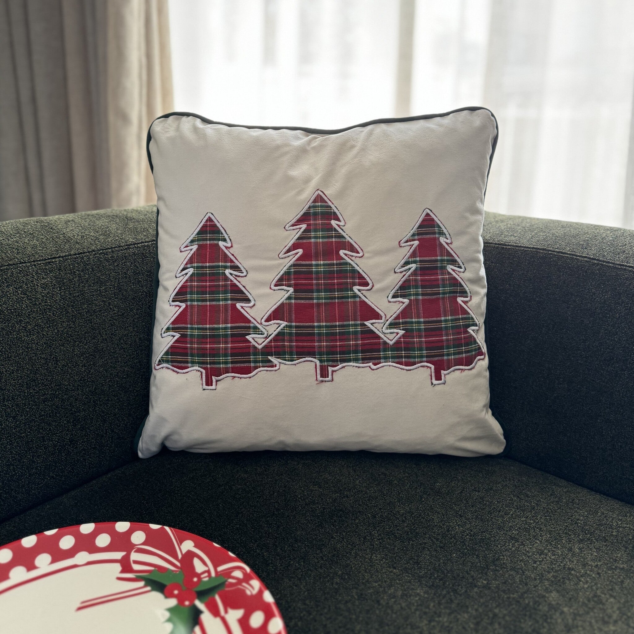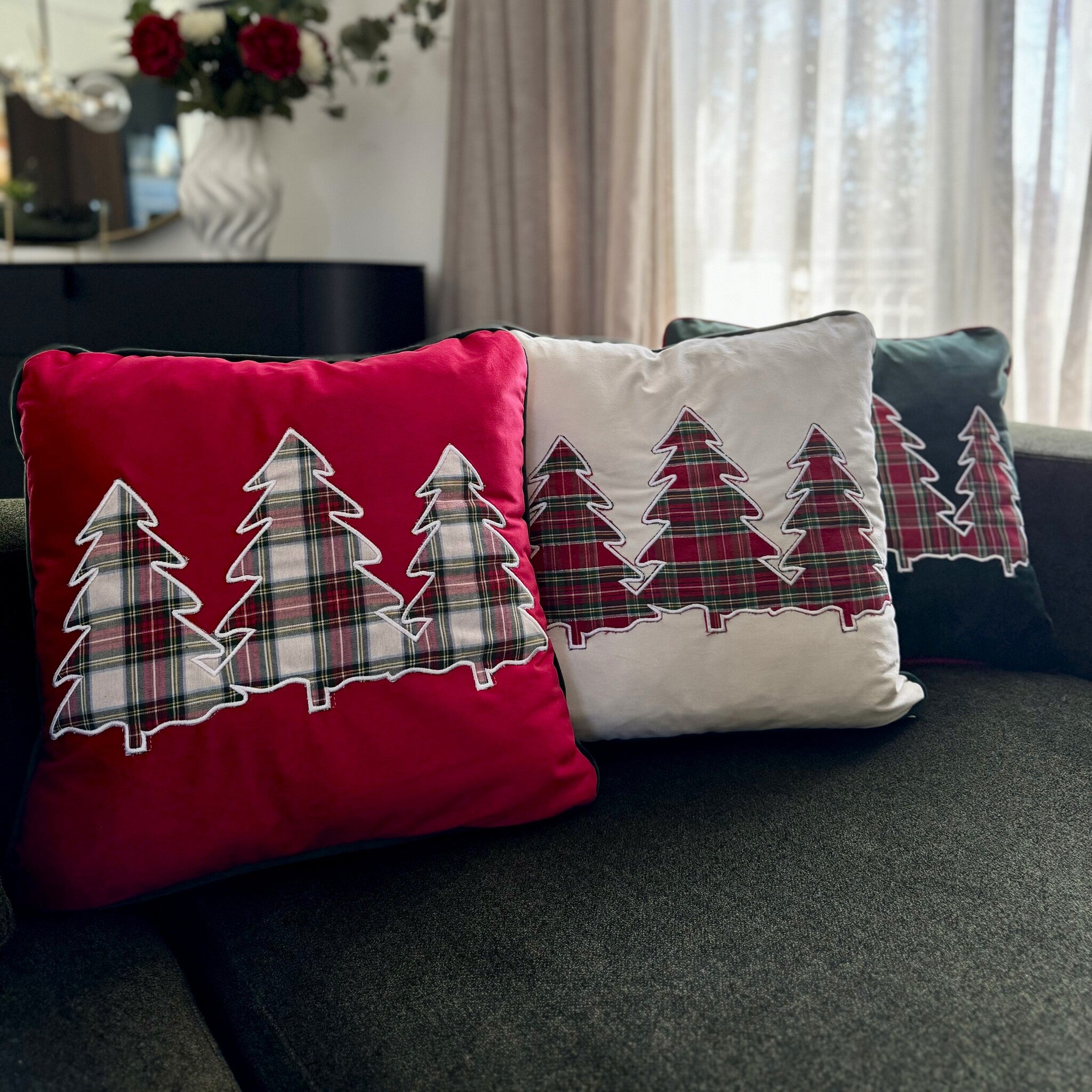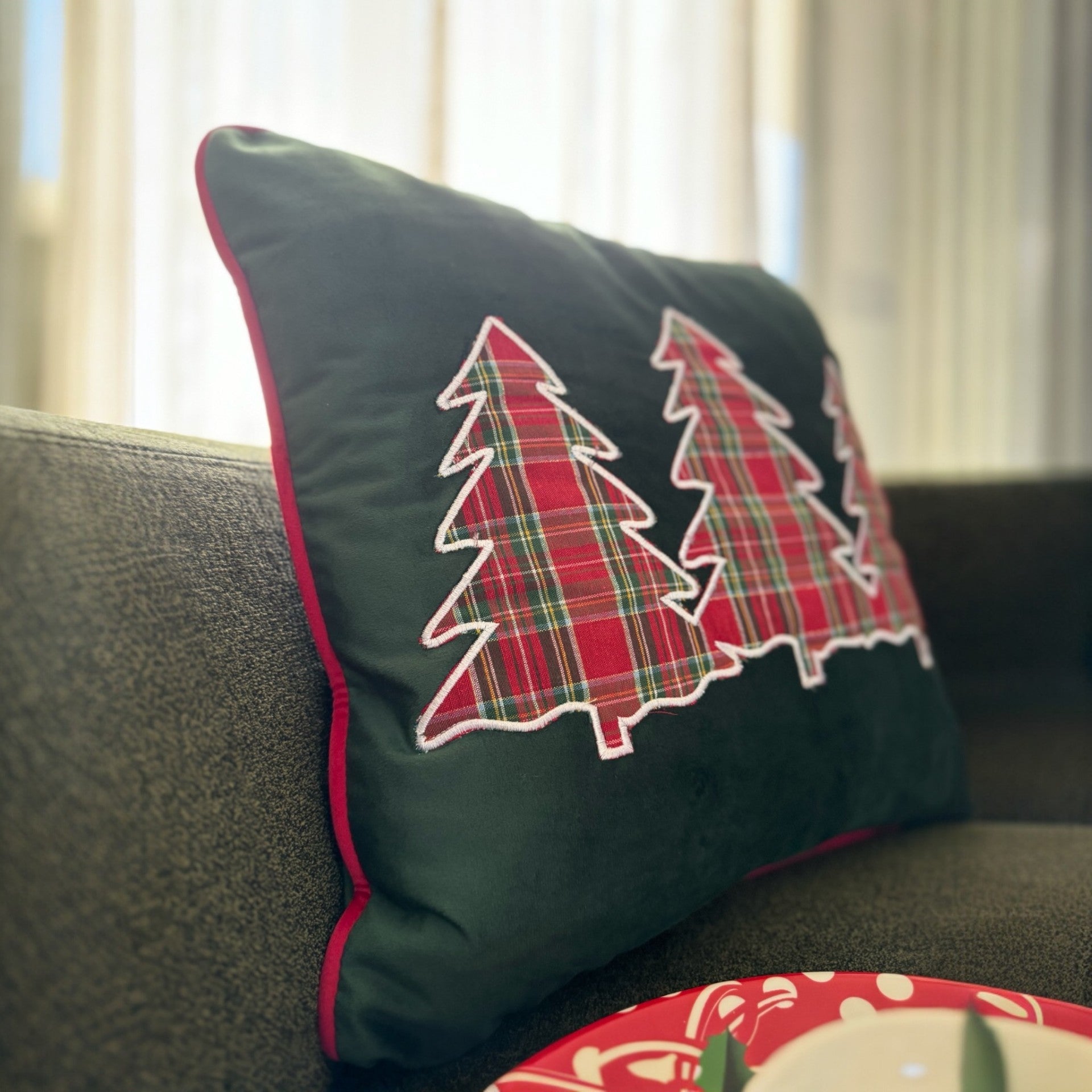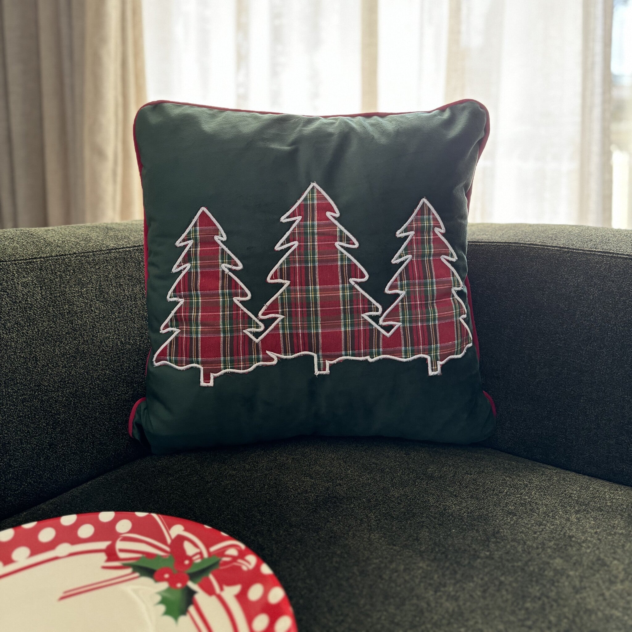 Dettagli: I cuscini Buccia di Mela sono rifiniti interamente con un cordoncino. Caratterizzati da tre alberi di natale con inserti in tessuto Tartan