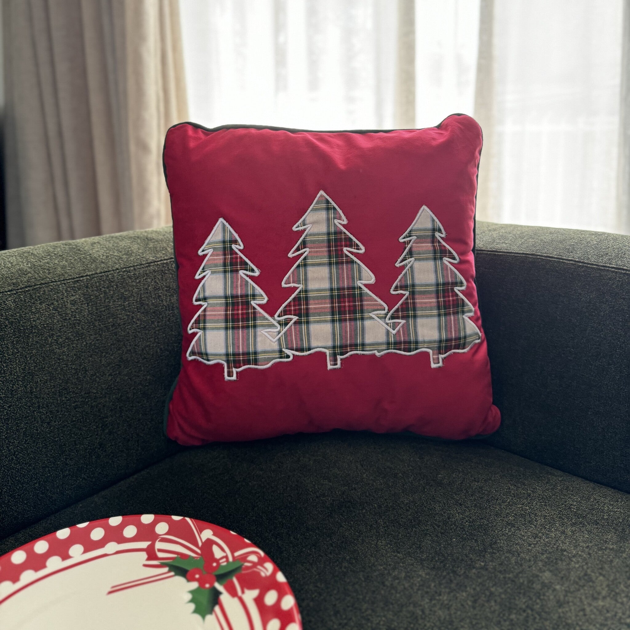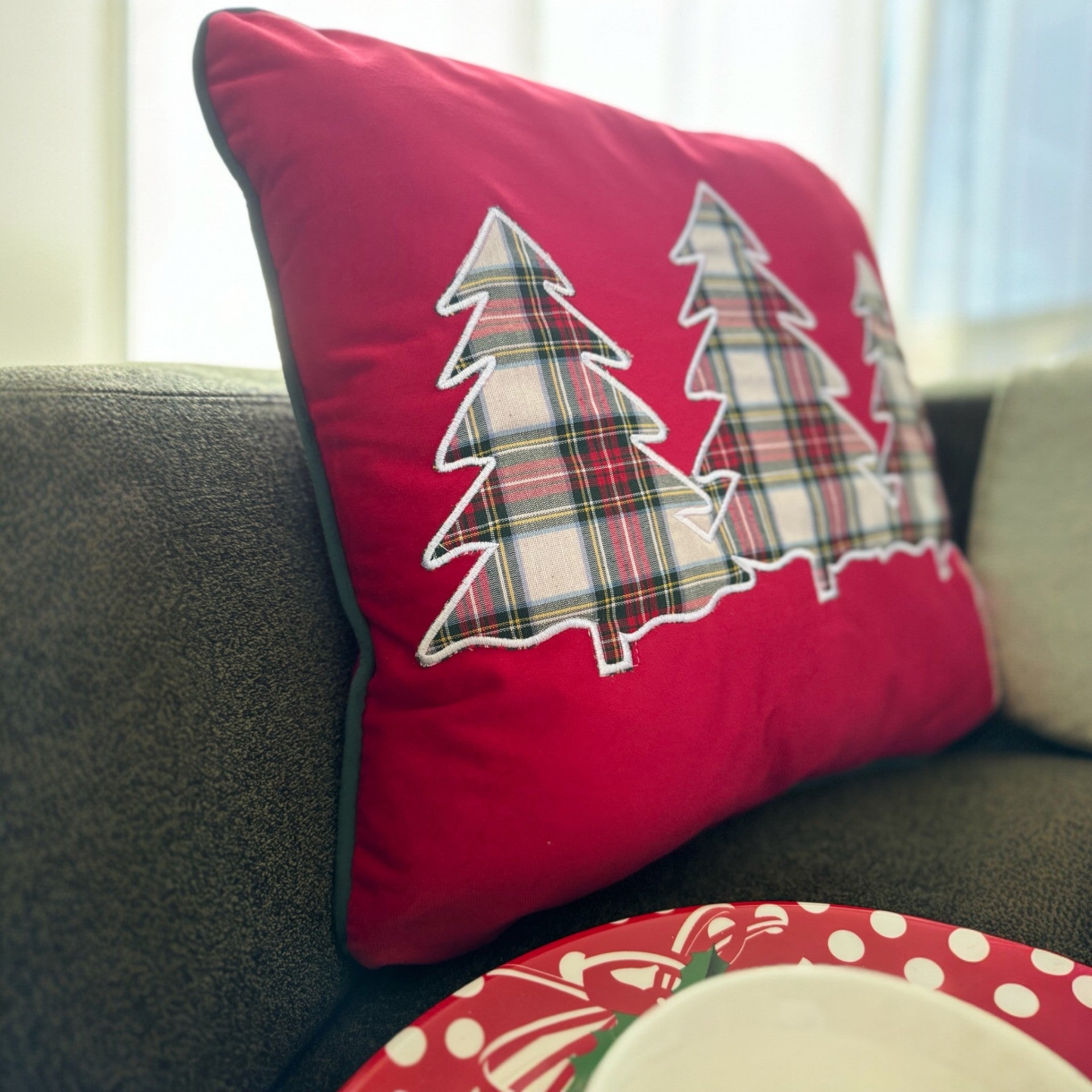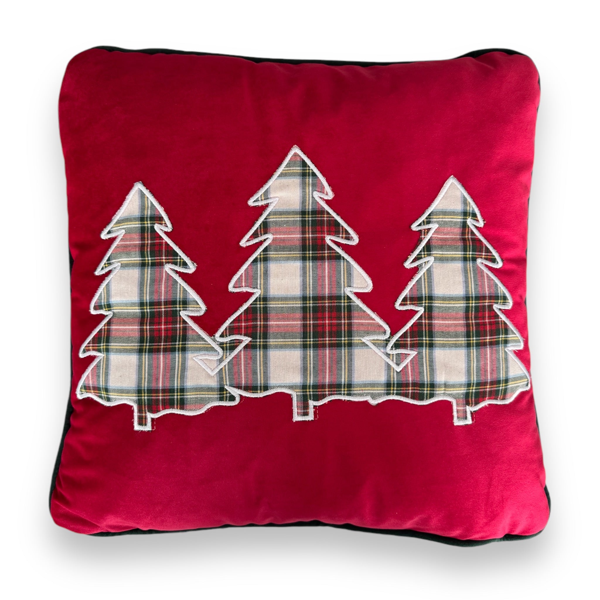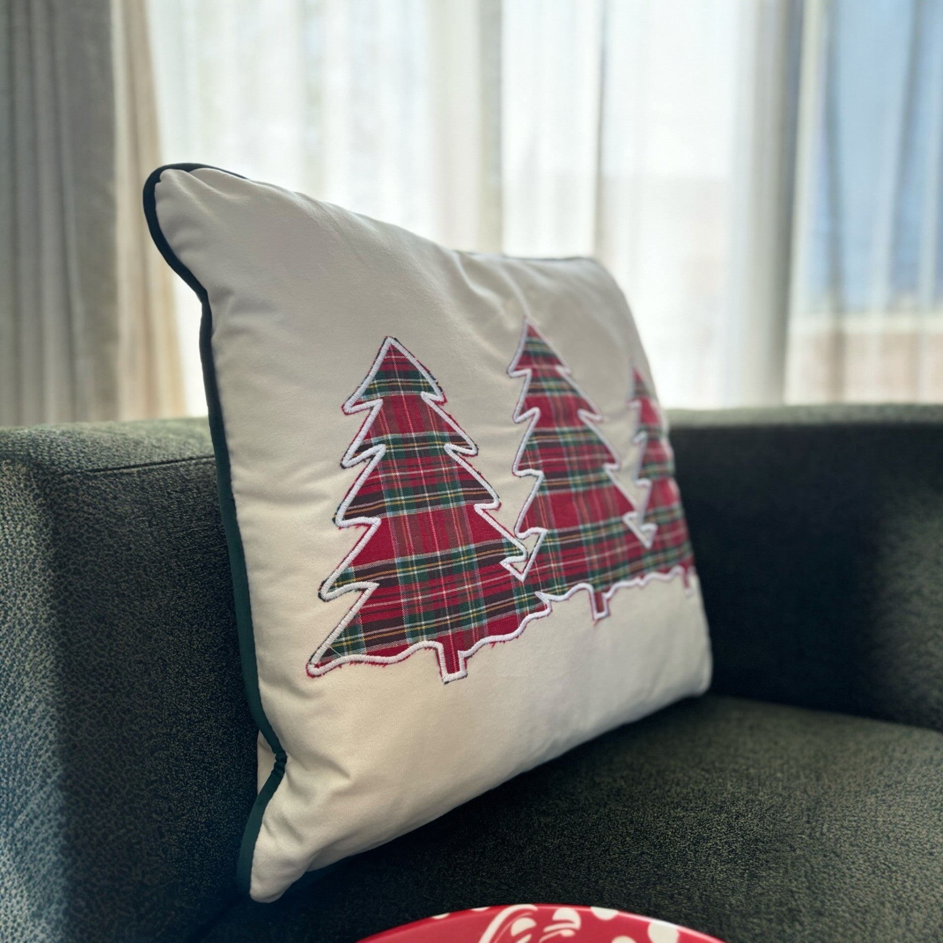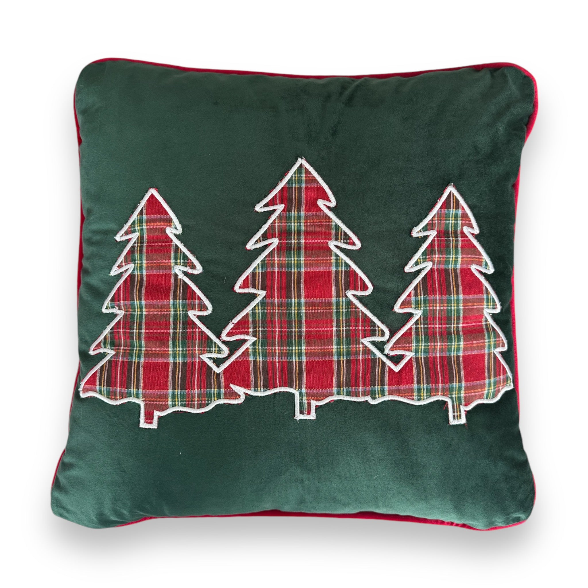 Dettagli: I cuscini Buccia di Mela sono rifiniti interamente con un cordoncino. Caratterizzati da tre alberi di natale con inserti in tessuto Tartan