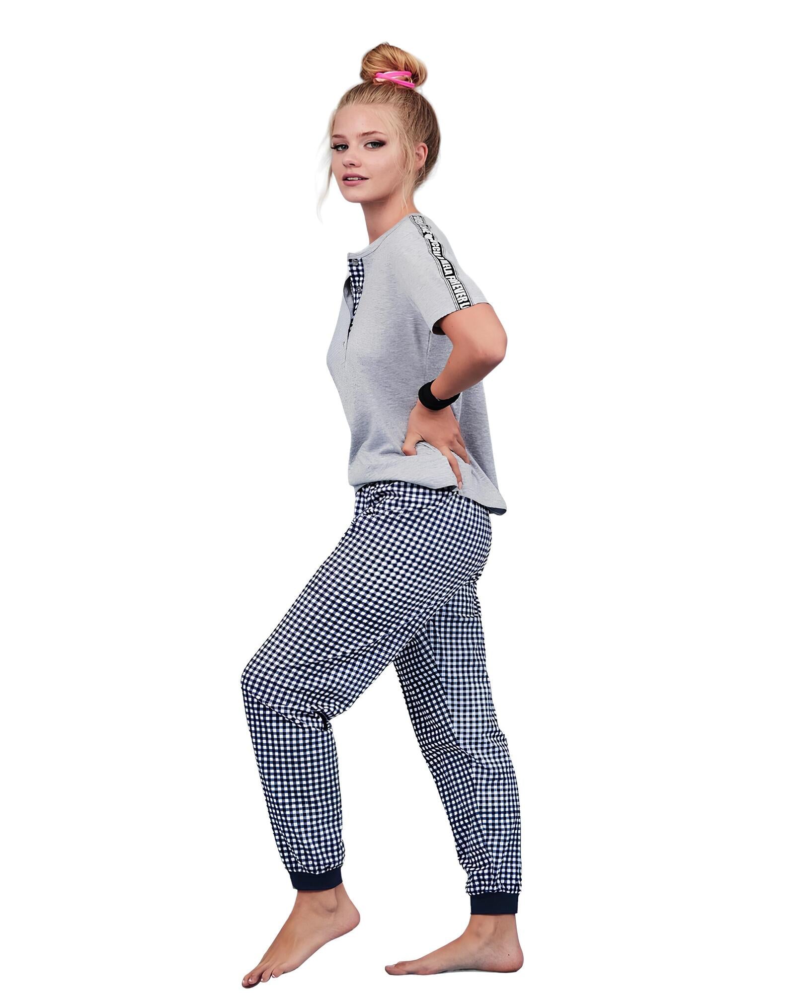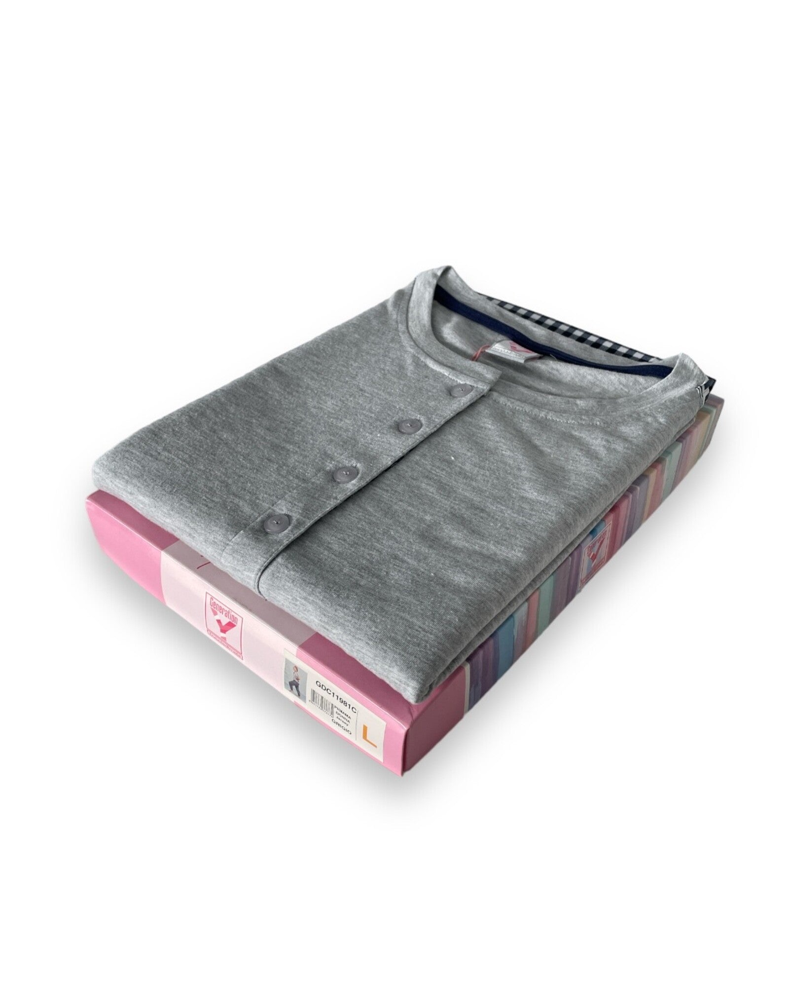 Women's pajamas in pure cotton with short-sleeved shirt and long trousers from the Buccia di Mela spring/summer collection. Composition 100% cotton, packaged in a box. Fresh and light cotton, suitable for all year round