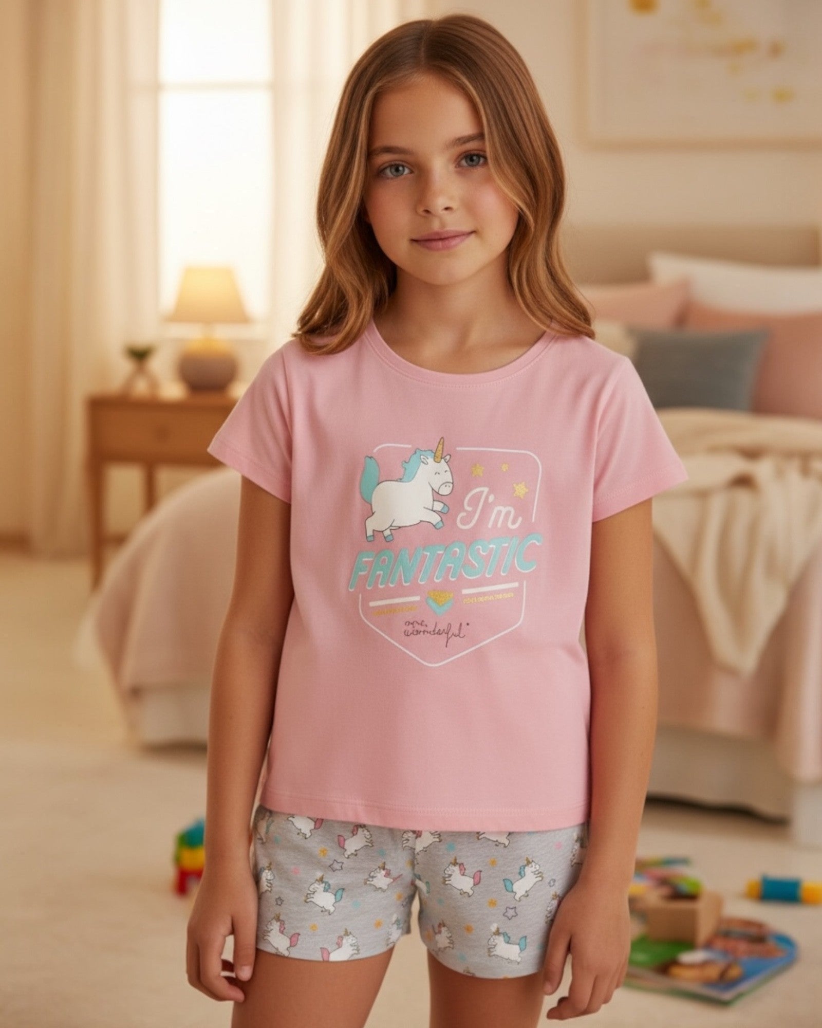 Shirt : Crew neck with short sleeves and unicorn print