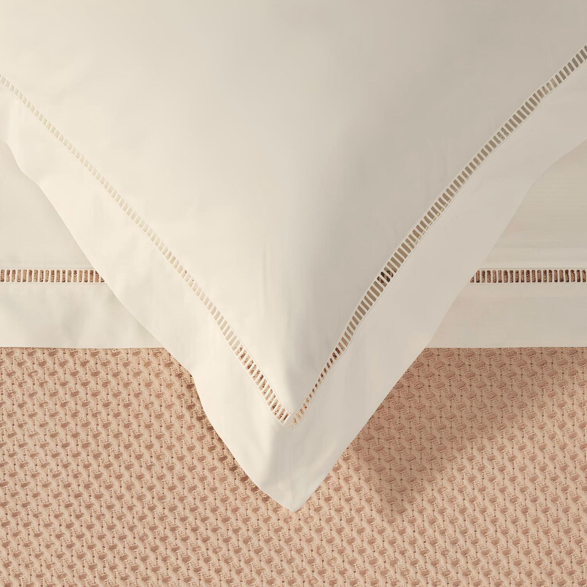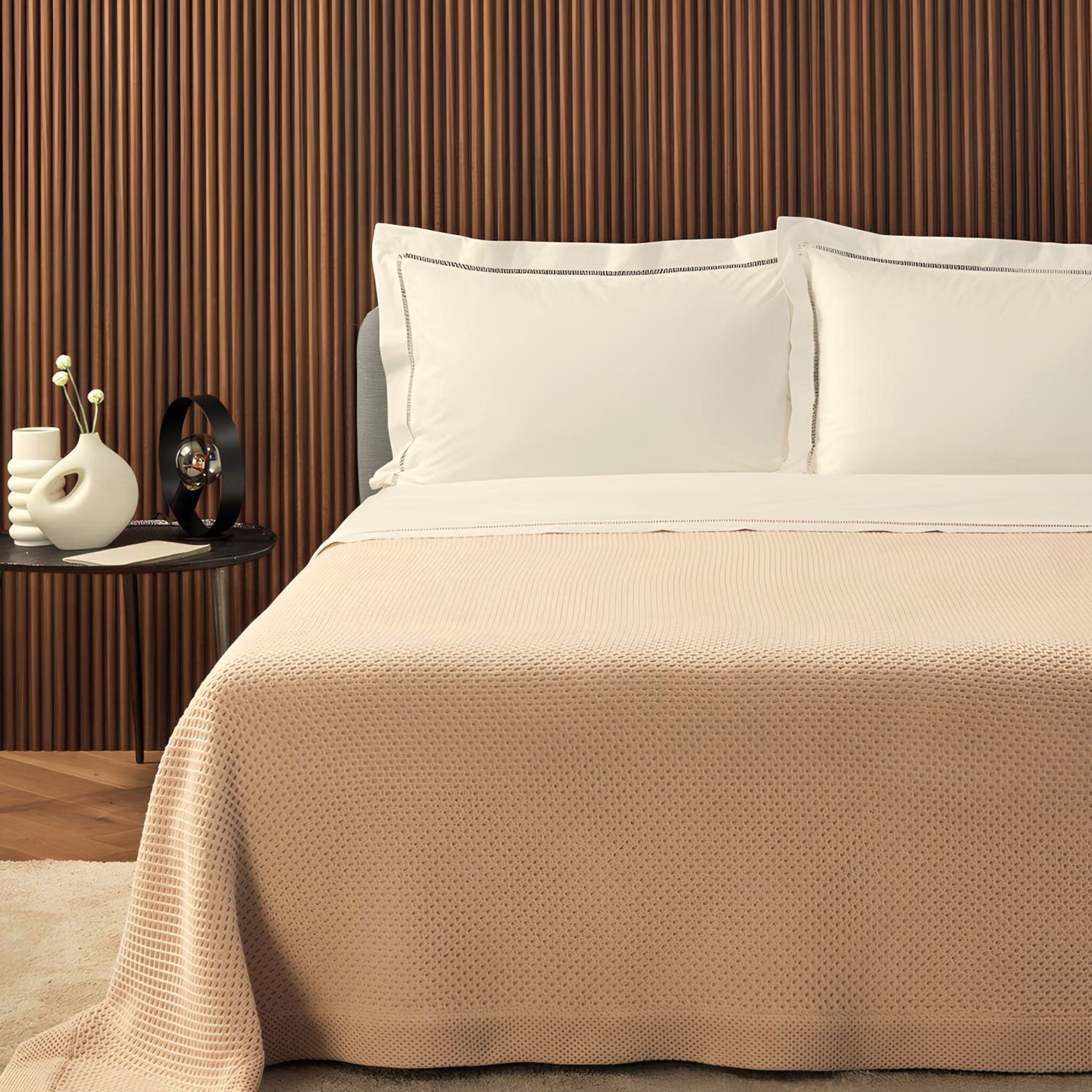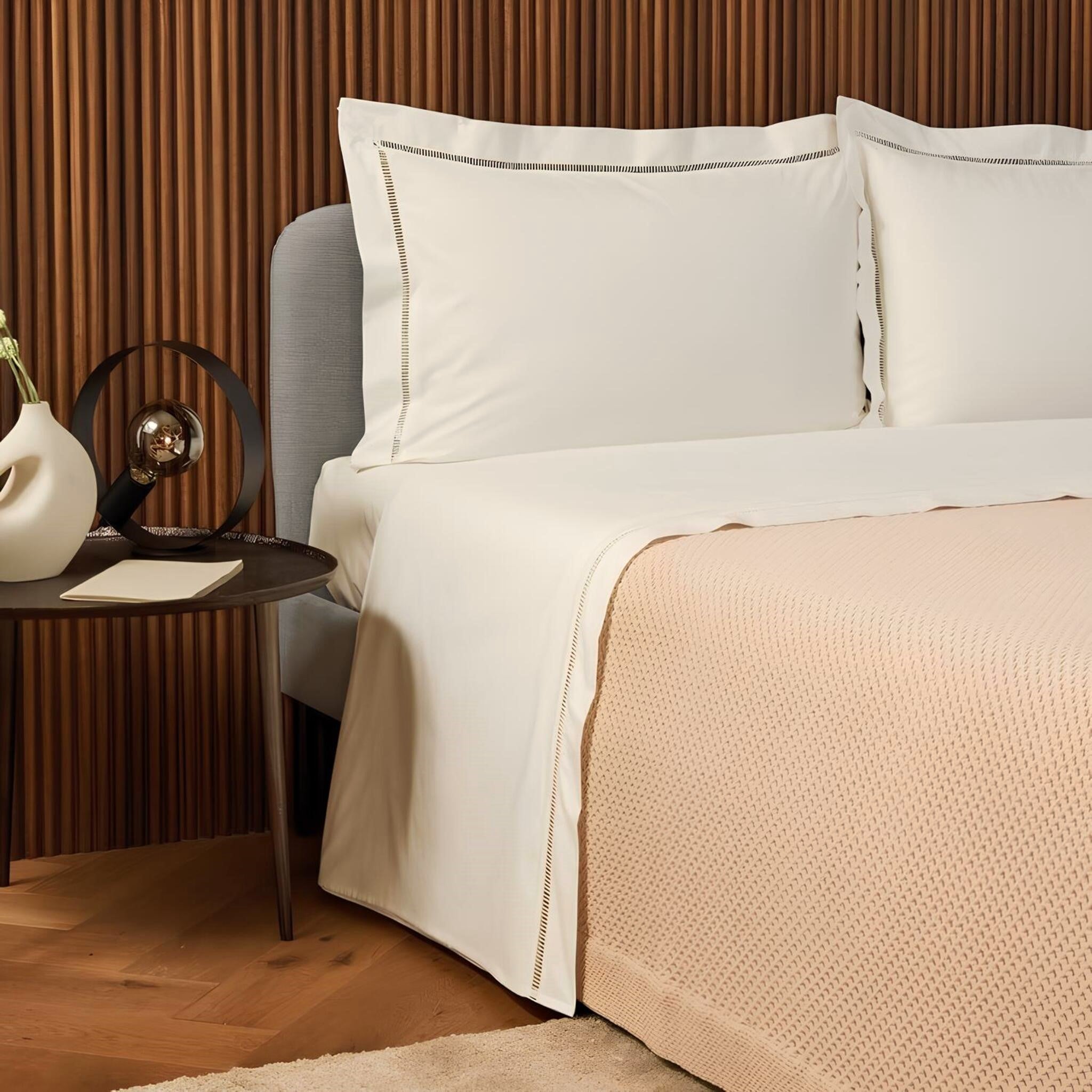 Belgioioso bed set in 80 threads per cm² pure cotton percale from the Zucchi Essential collection. The protagonist is soft percale available in timeless and delicate natural shades, for warm and enveloping atmospheres. A solid color proposal enriched by the refined detail of the à jour finish which embellishes the pillowcases and the edge of the sheet. The border motif takes up the detail of a printing block from the Zucchi Museum which offers an alternation of small grid paintings in a chessboard of solids and voids. The white fitted sheet fits mattresses up to 30cm high. The bed sets from the Zucchi collection are Made in Italy, have been tested for dangerous substances and are certified according to STANDARD 100 by OEKO-TEX® 1002995.O CENTROCOT www.oeko-tex.com/standard100