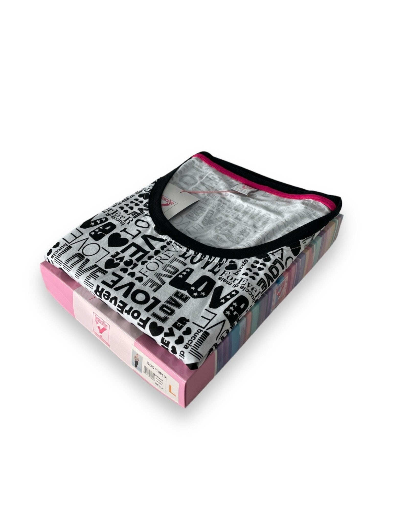 Women's pajamas in pure cotton with short-sleeved shirt and long stretch leggings from the Buccia di Mela spring/summer collection. Composition 100% cotton, packaged in a box. Fresh and light cotton, suitable for all year round