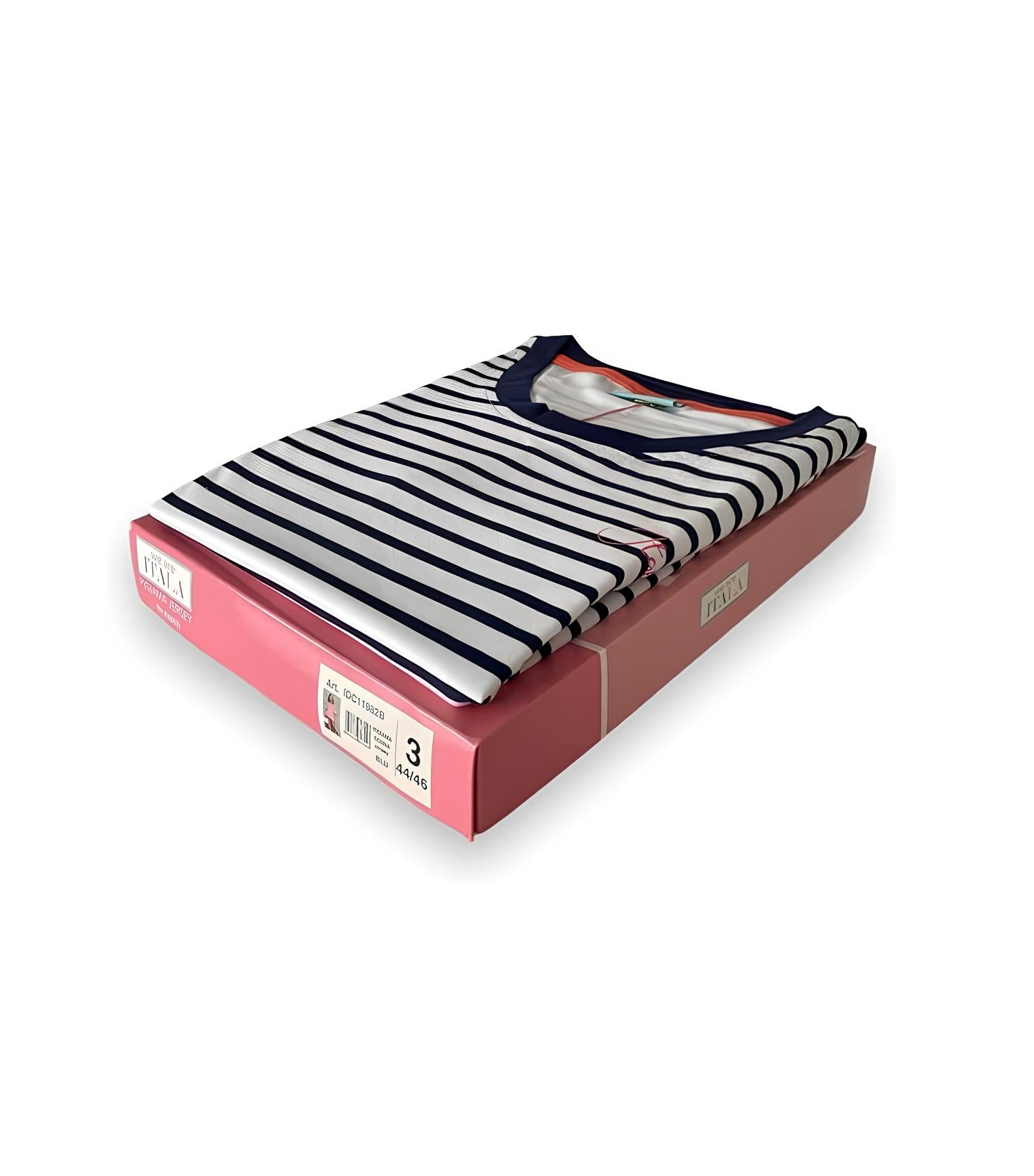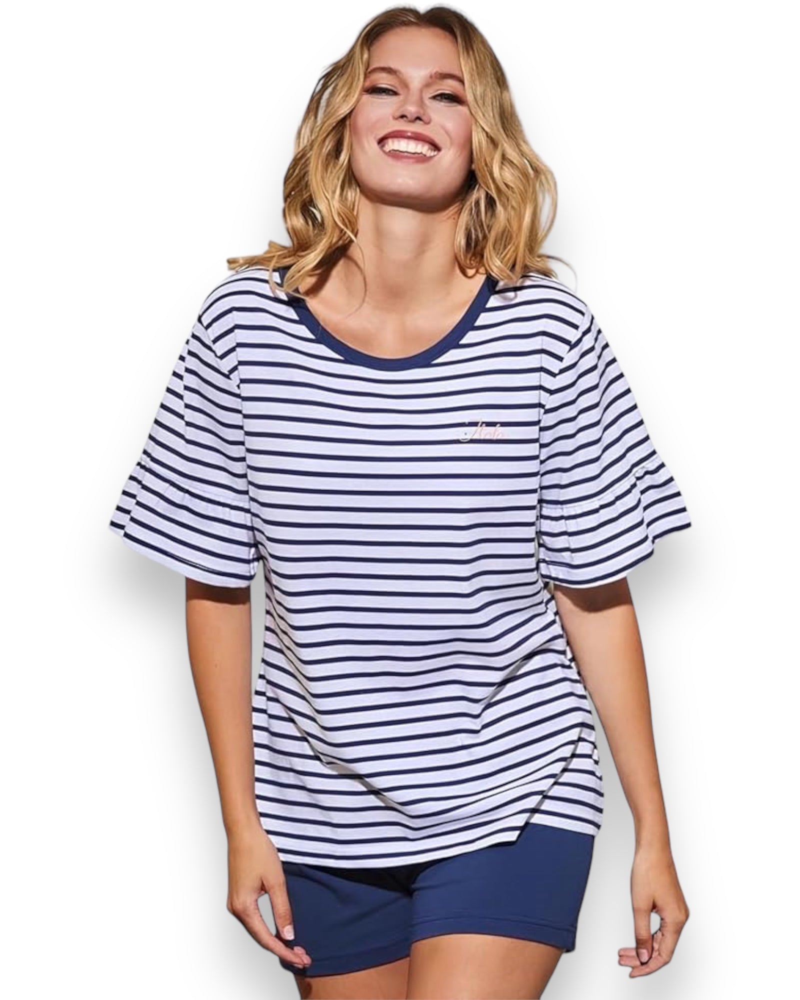 Itala pajamas with a modern and fresh print, made of 100% cotton fabric which makes it compact and soft to wear. Short-sleeved crew-neck sweater and shorts. Packaged in box
