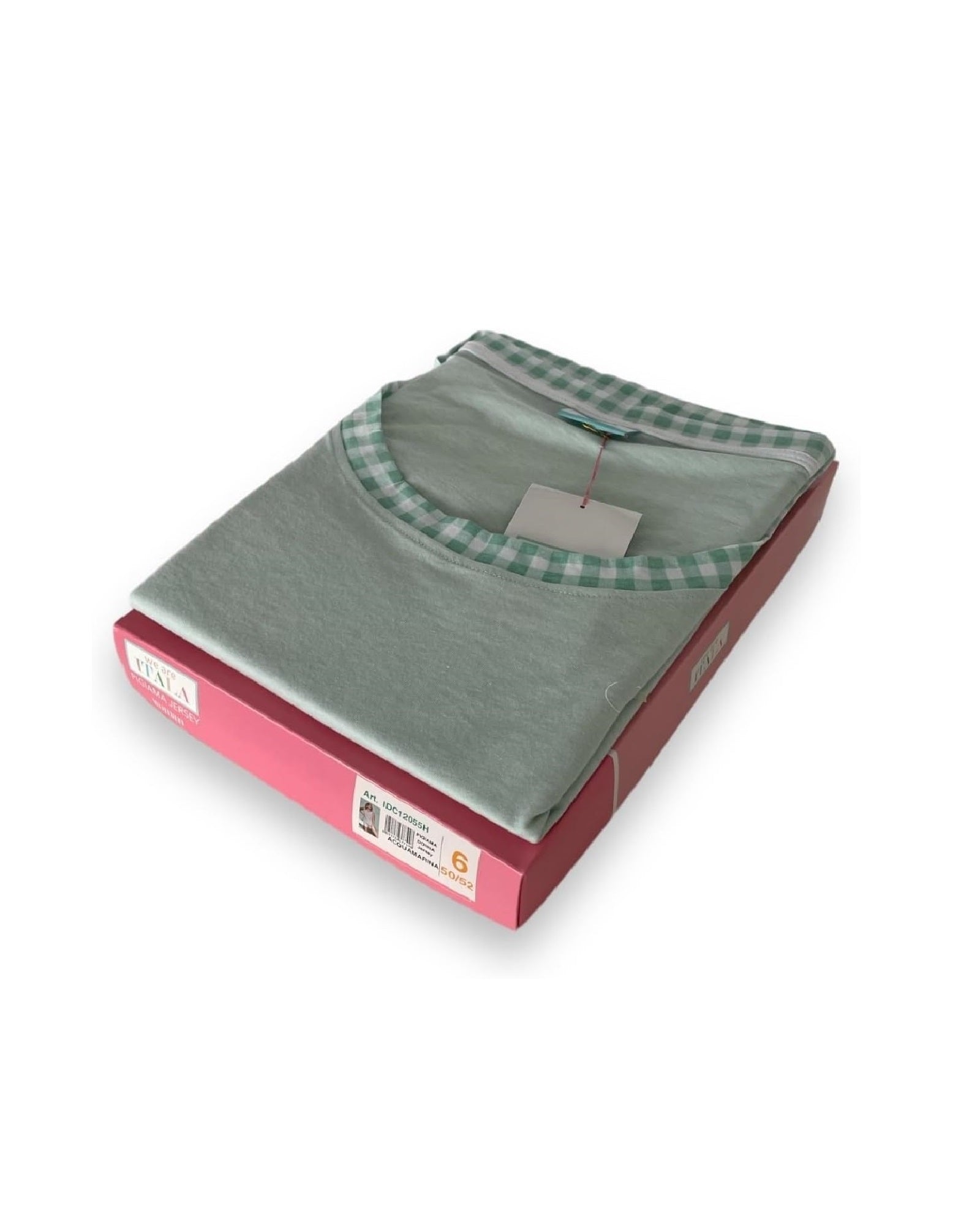 Itala pajamas with a modern and fresh print, made of 100% cotton fabric which makes it compact and soft to wear. Ideal for mild seasons, such as spring and autumn. Shirt: Wide shoulder crew neck. Trousers: Short checked. Packaged in box