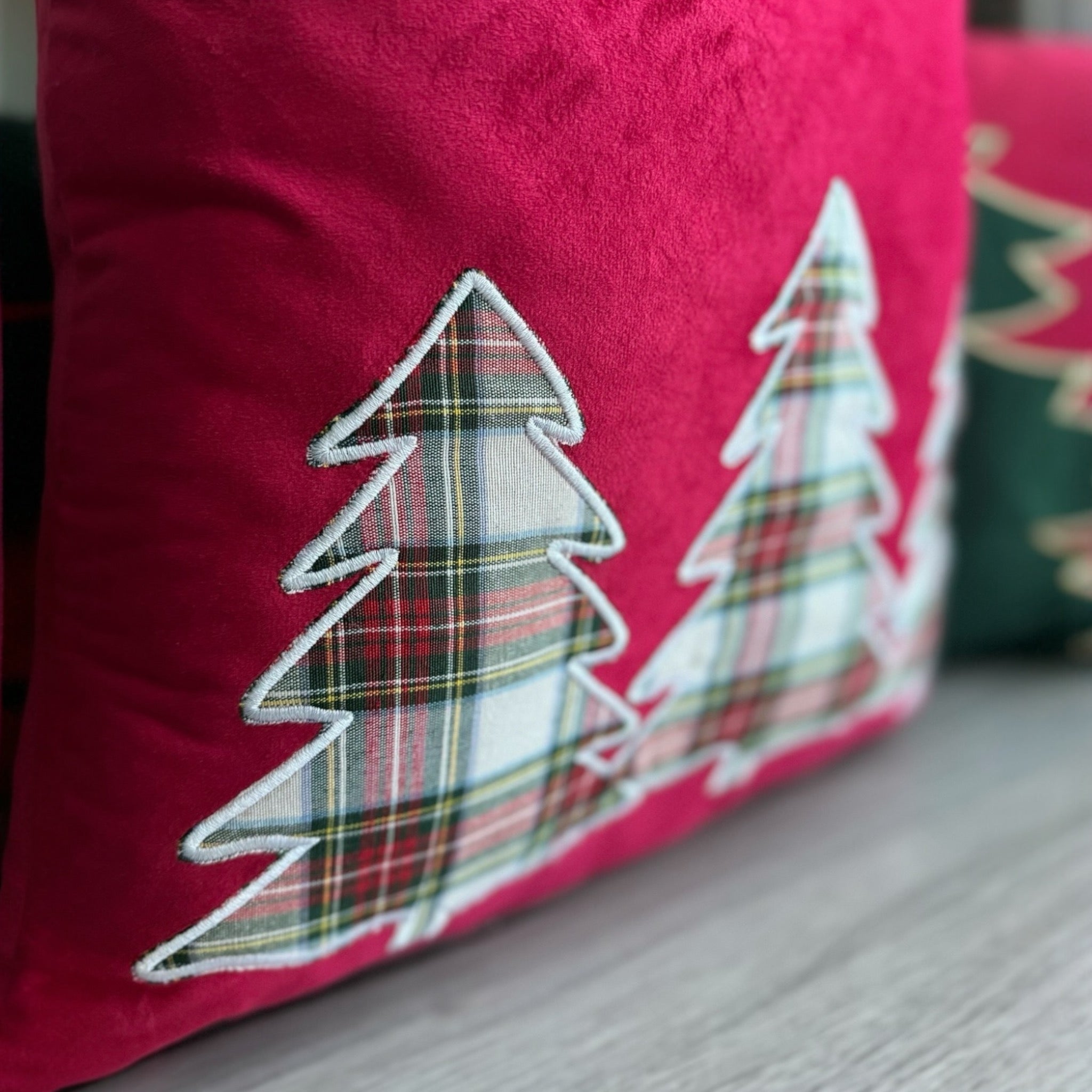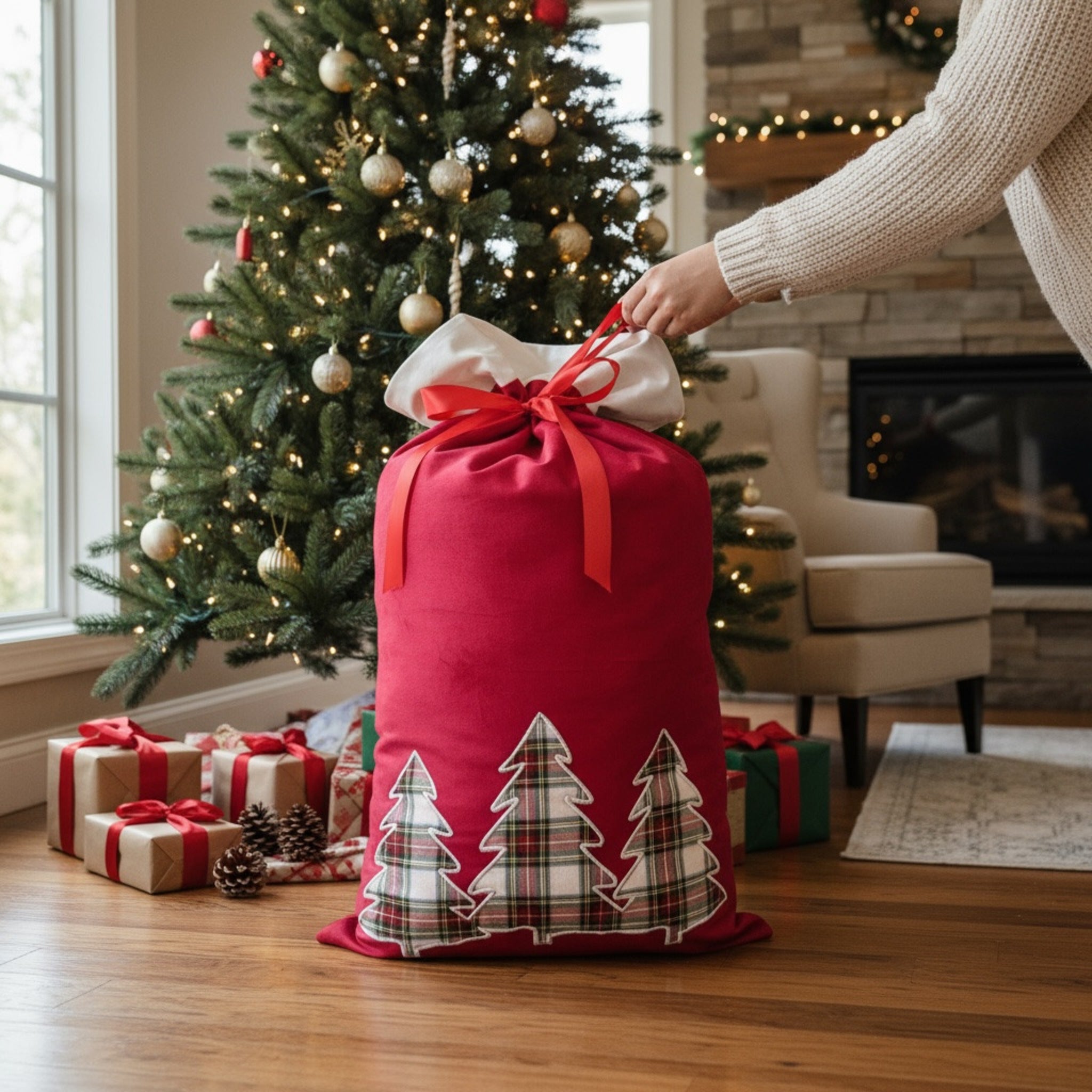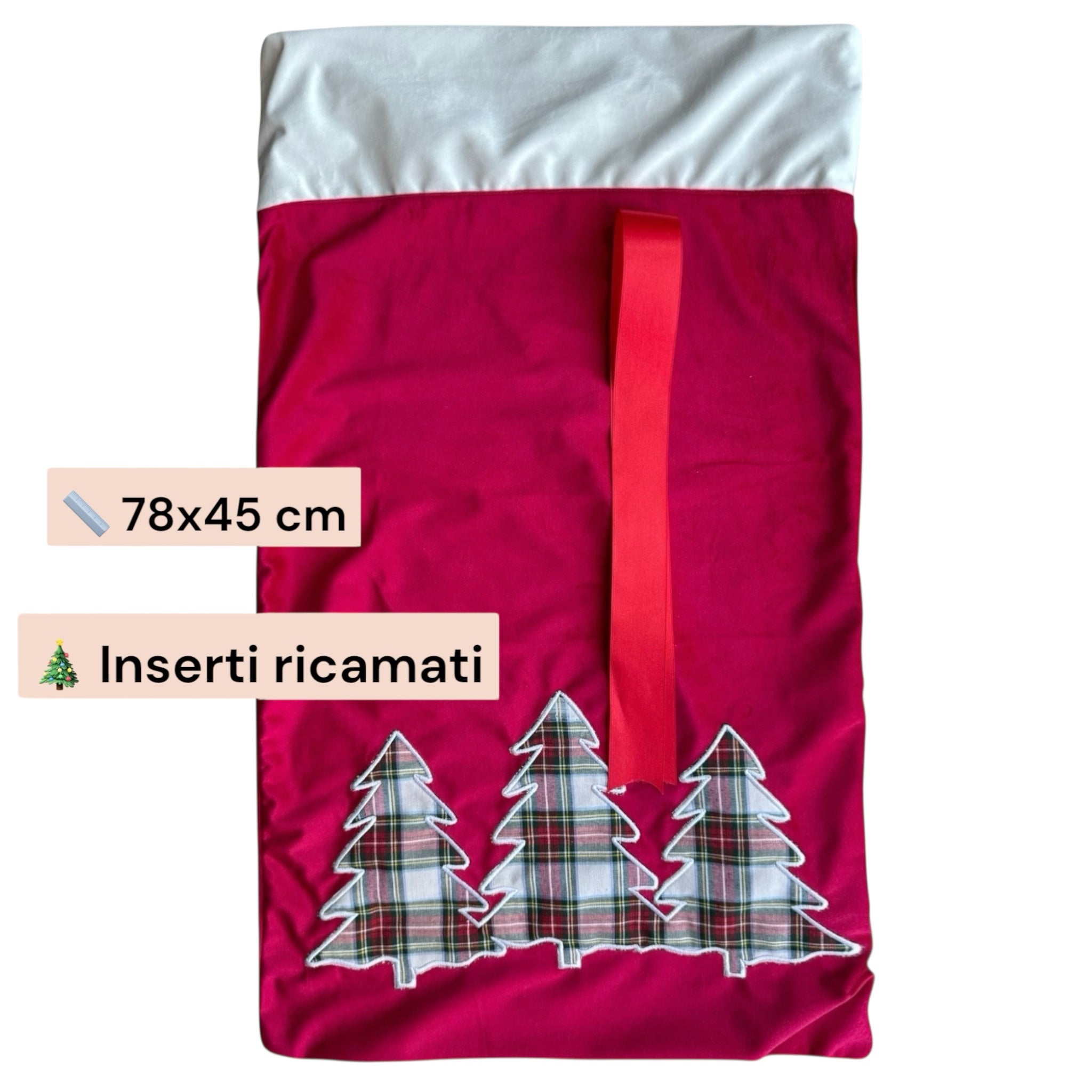Realizzato in morbido velluto rosso, questo sacco è impreziosito da inserti ricamati con alberi di Natale in fantasia scozzese che donano un tocco caldo e tradizionale all’ambiente.