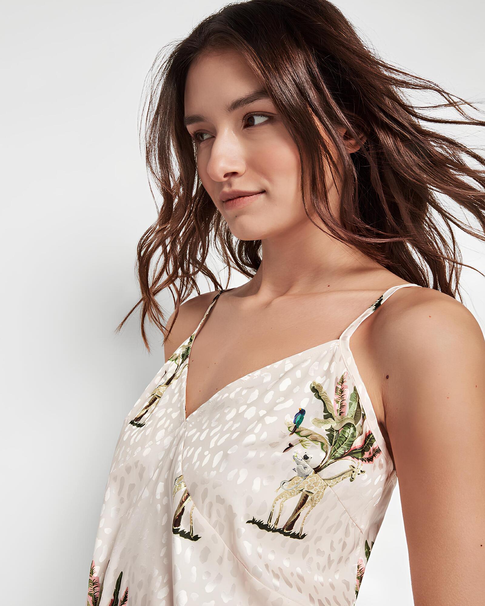 Il design con spalline sottili regolabili valorizza la silhouette femminile, mentre la raffinata fantasia Jungle dona un tocco moderno ed esotico, perfetto per chi ama distinguersi anche nei momenti di relax. Il colore naturale rende il capo luminoso, delicato e facile da indossare.