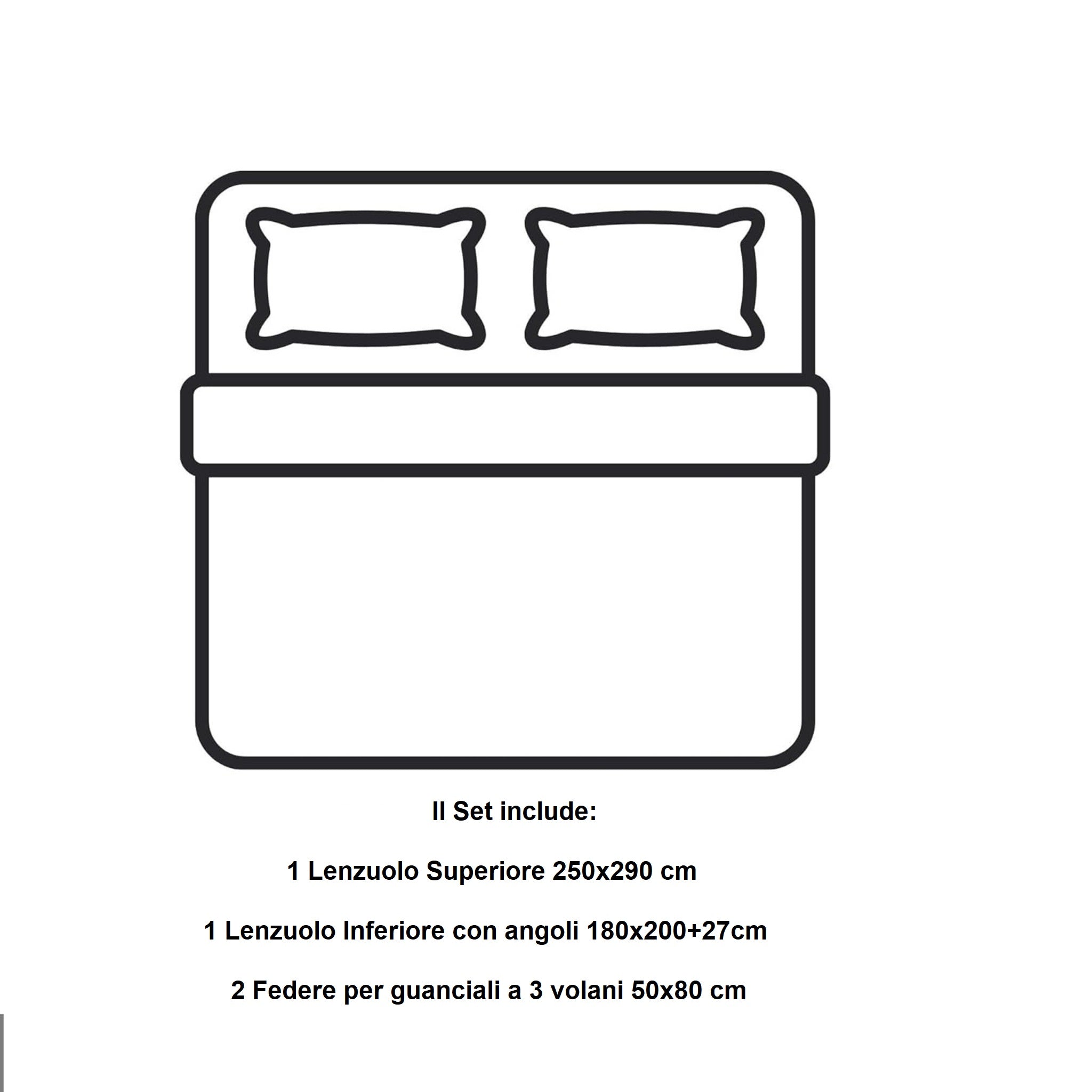 Set matrimoniale completo – Include lenzuolo sopra 250x290 cm, lenzuolo sotto 180x200 cm con angoli per materassi fino a 27 cm e 2 federe 50x80 cm con 3 volani