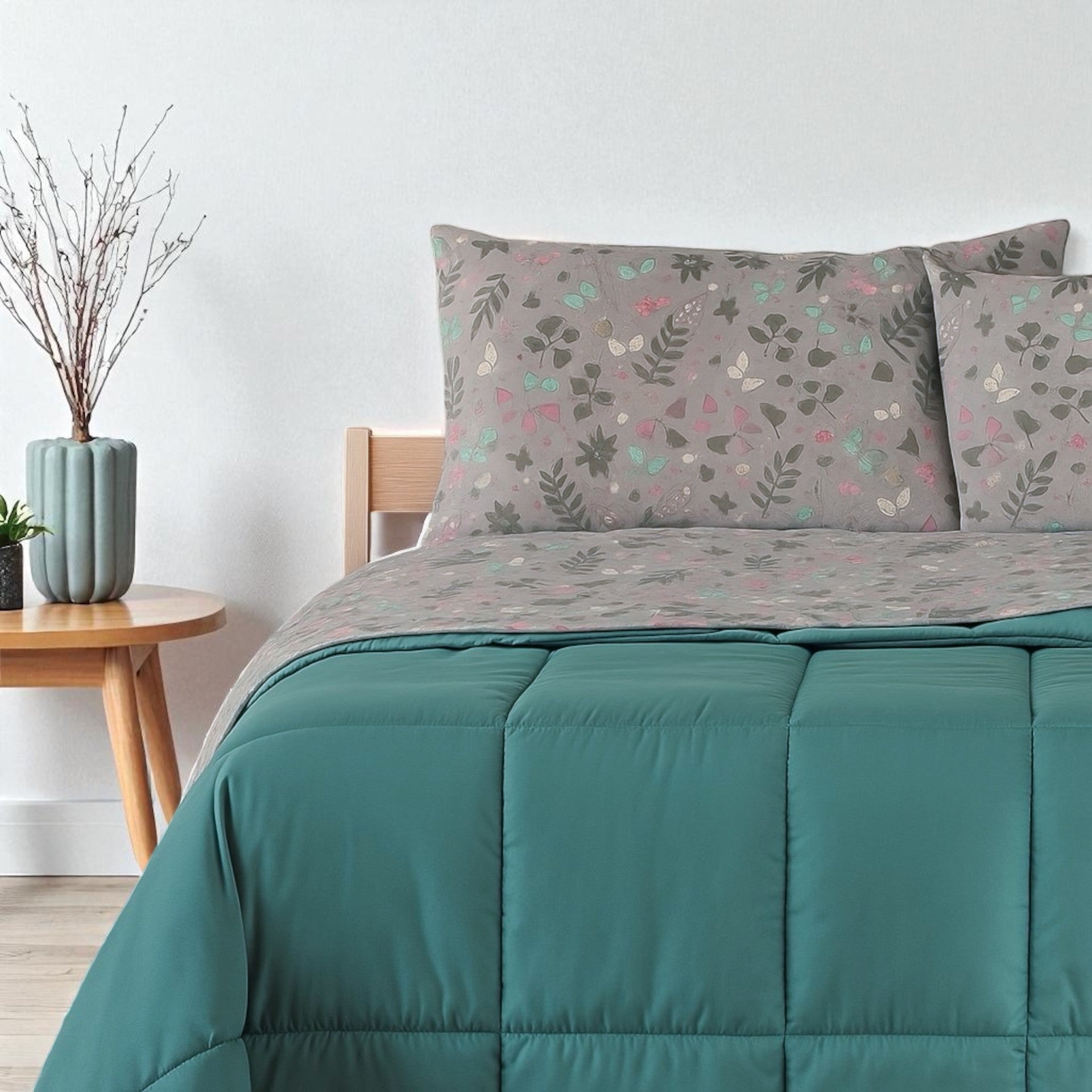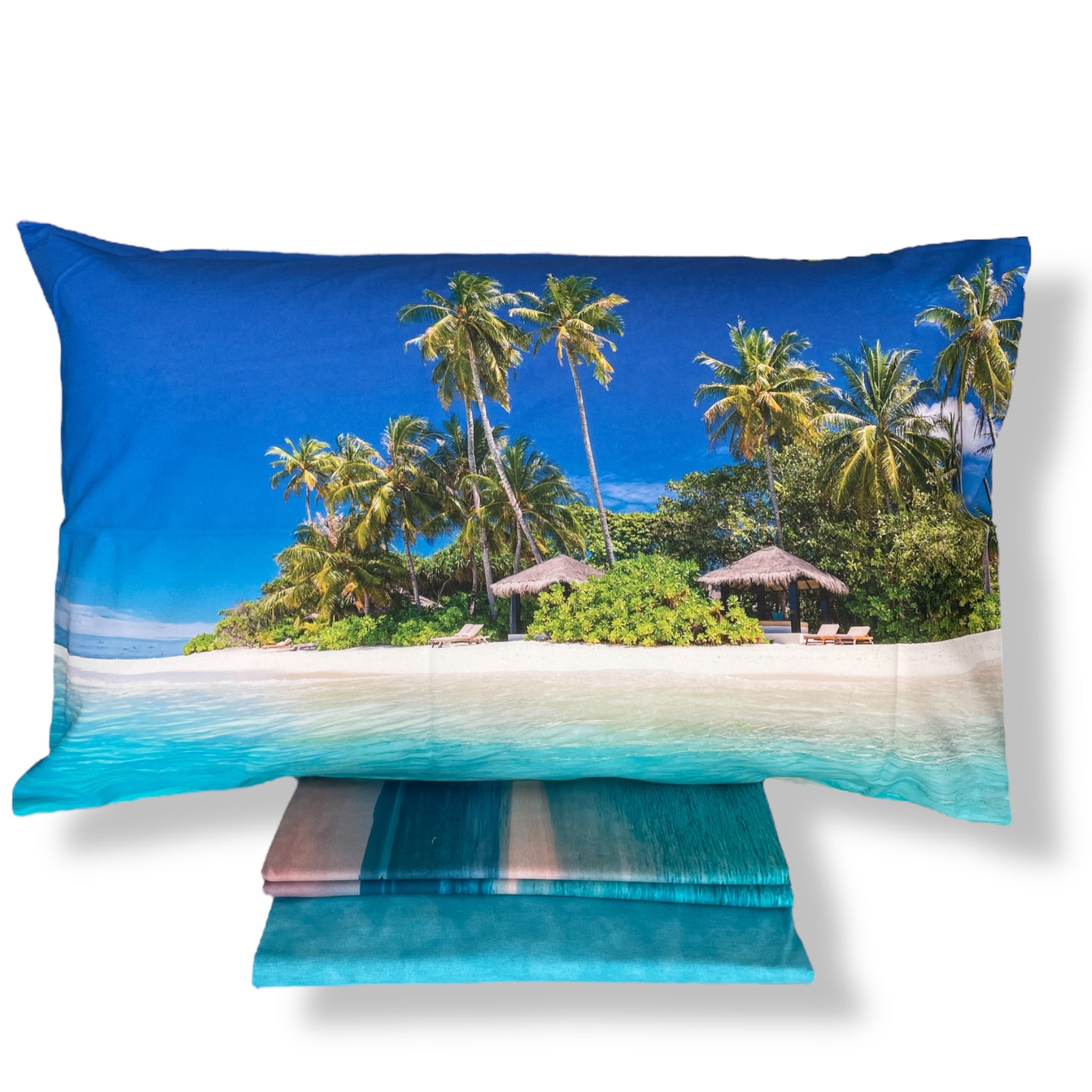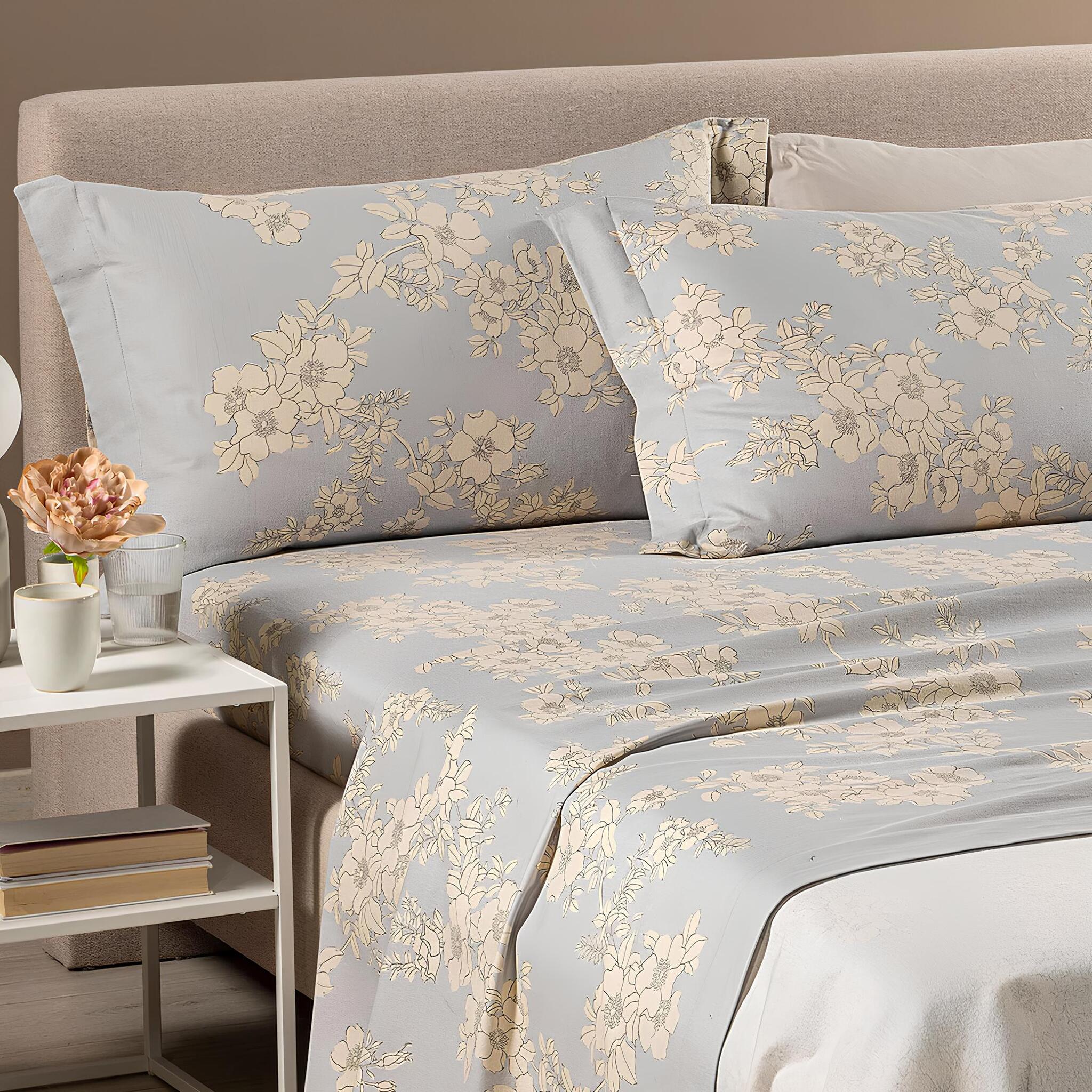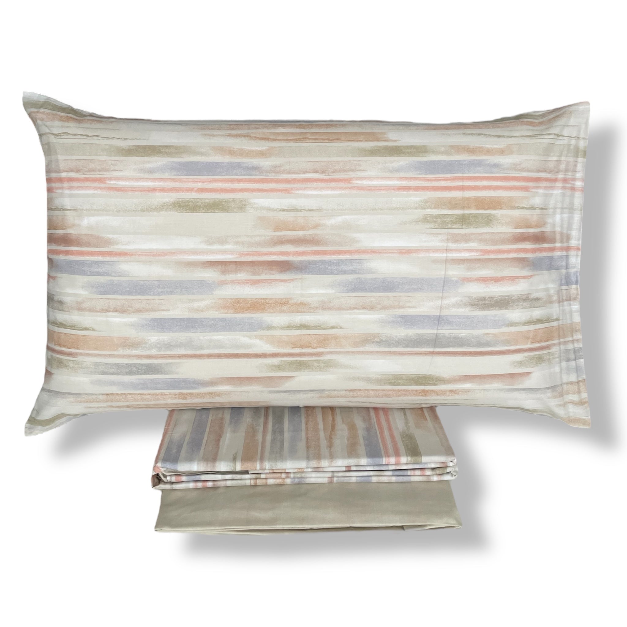 Il set comprende un lenzuolo superiore (180x280 cm), un lenzuolo inferiore con angoli in tinta unita (125x200 cm) e due federe 50x80 cm coordinate, per un look elegante e armonioso.