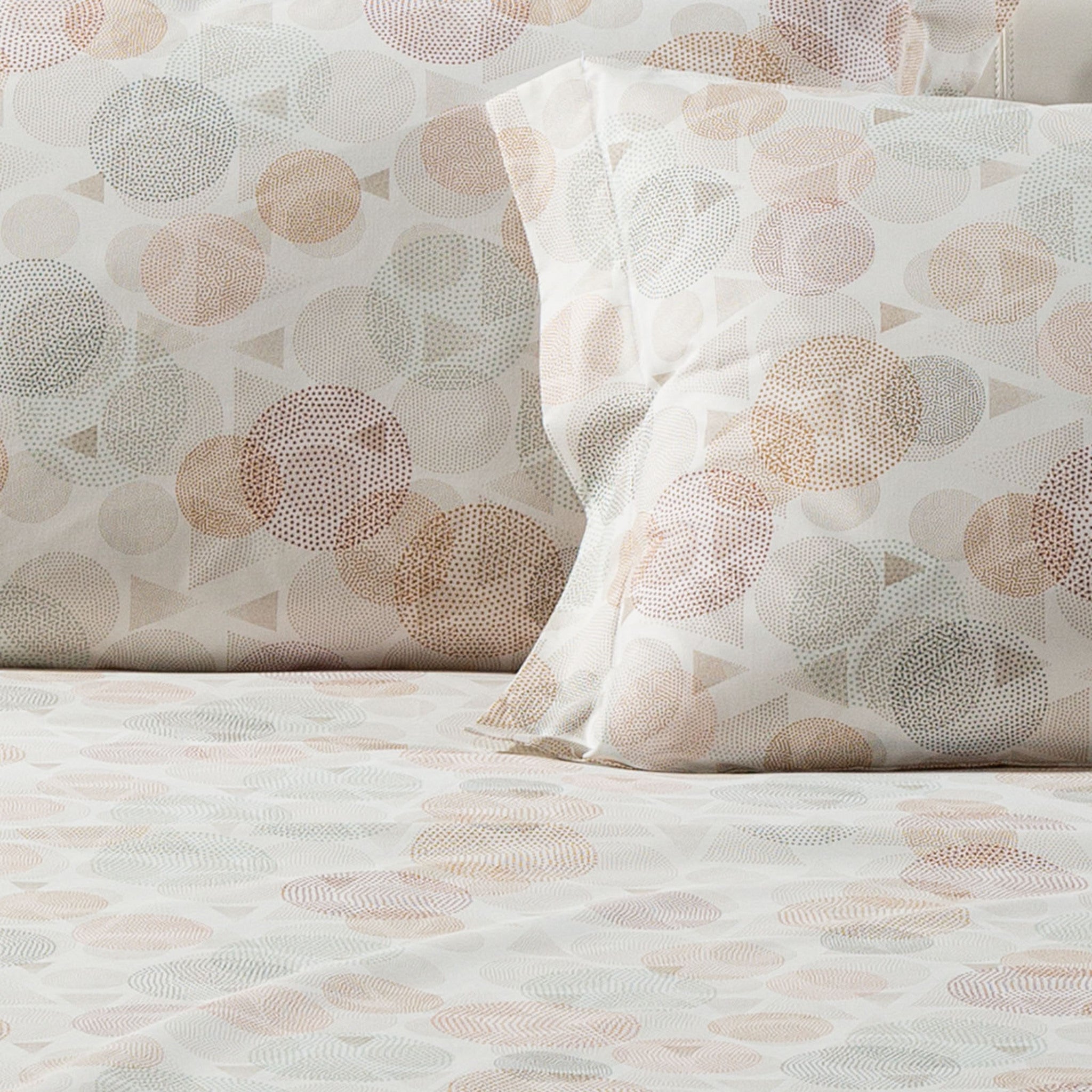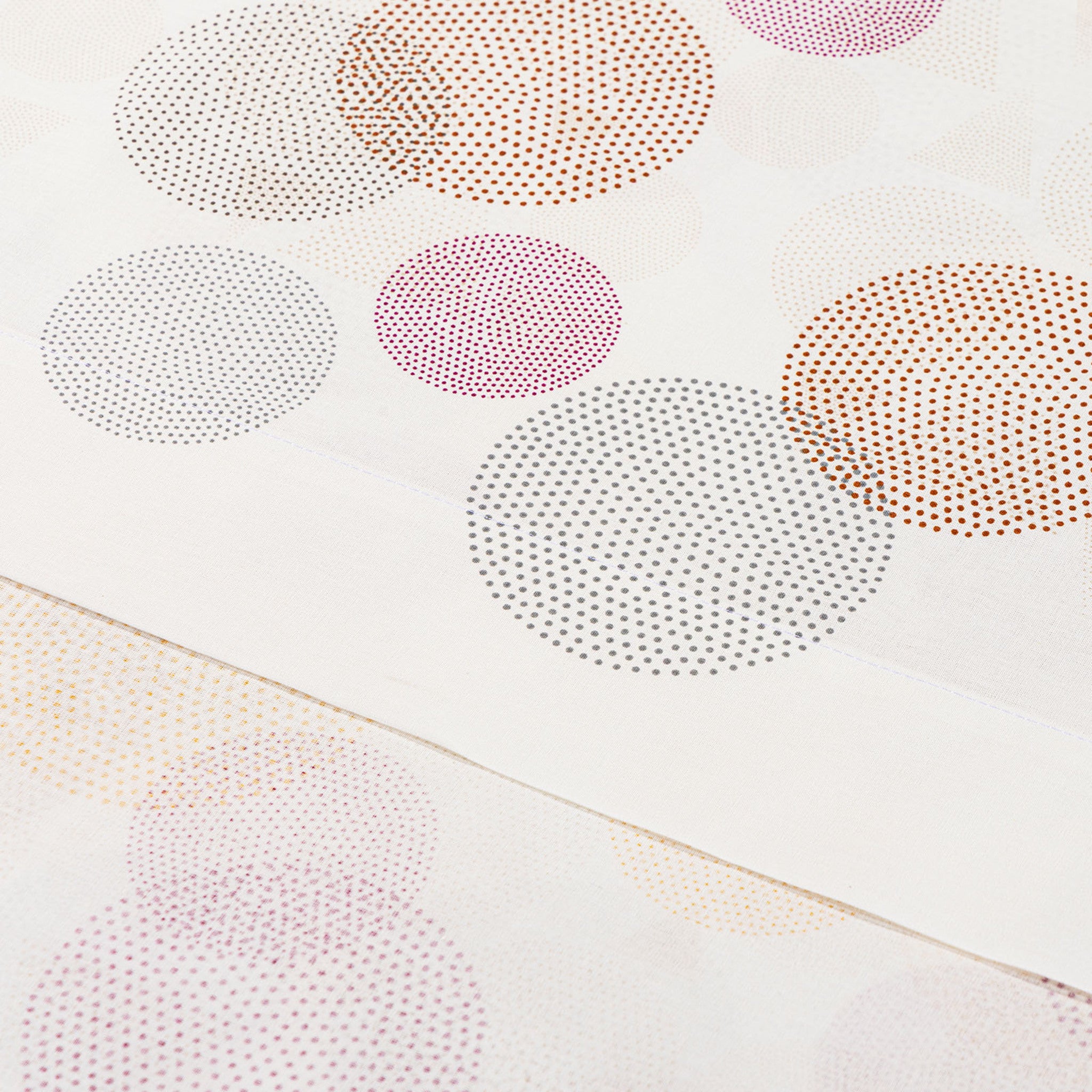 La fantasia a cerchi nei toni del corallo, azzurro e ambra regala uno stile contemporaneo e raffinato, adatto a ogni tipo di ambiente.