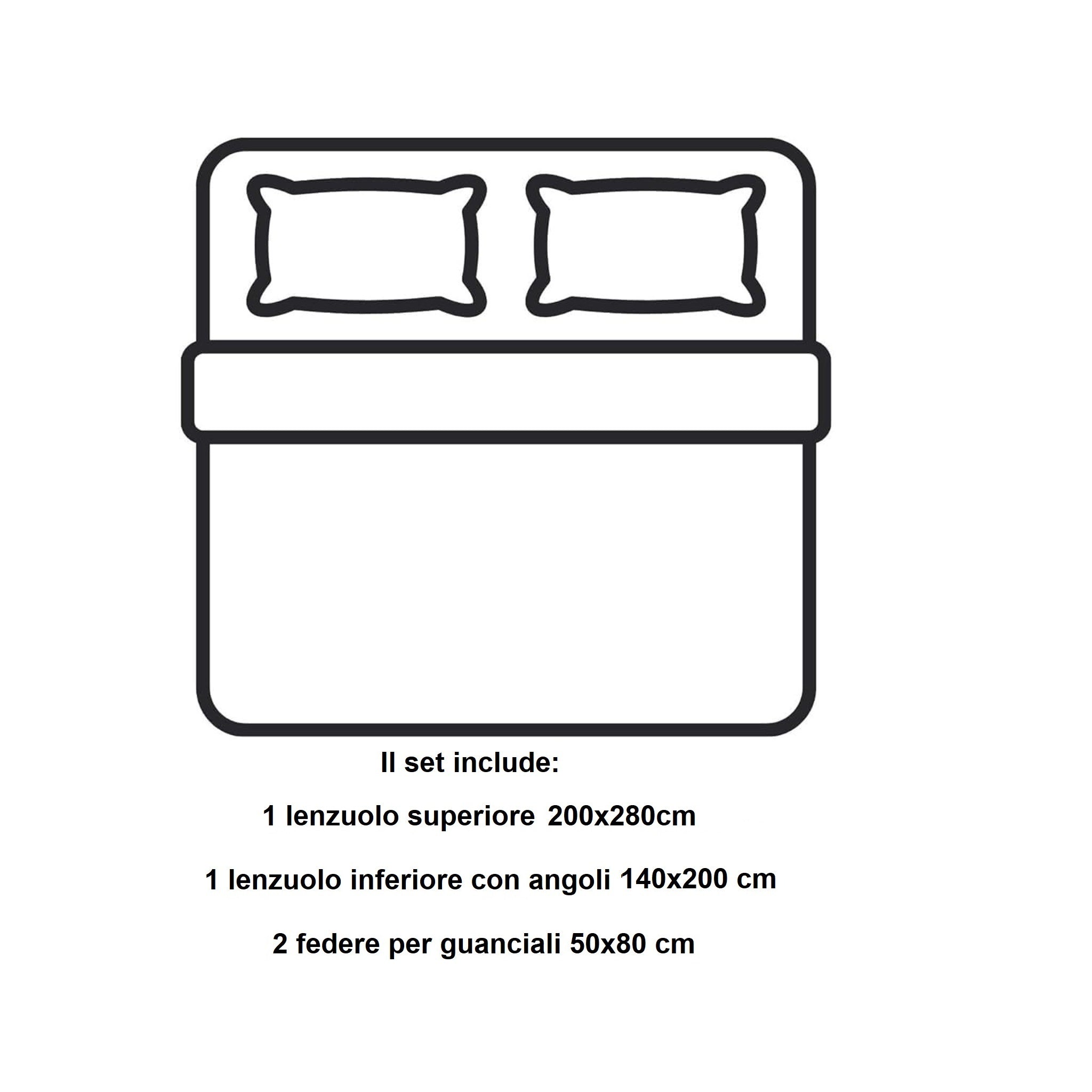 📏 Dimensioni: sopra 200x280 cm – sotto 140x200 cm con angoli – 2 federe 50x80 cm