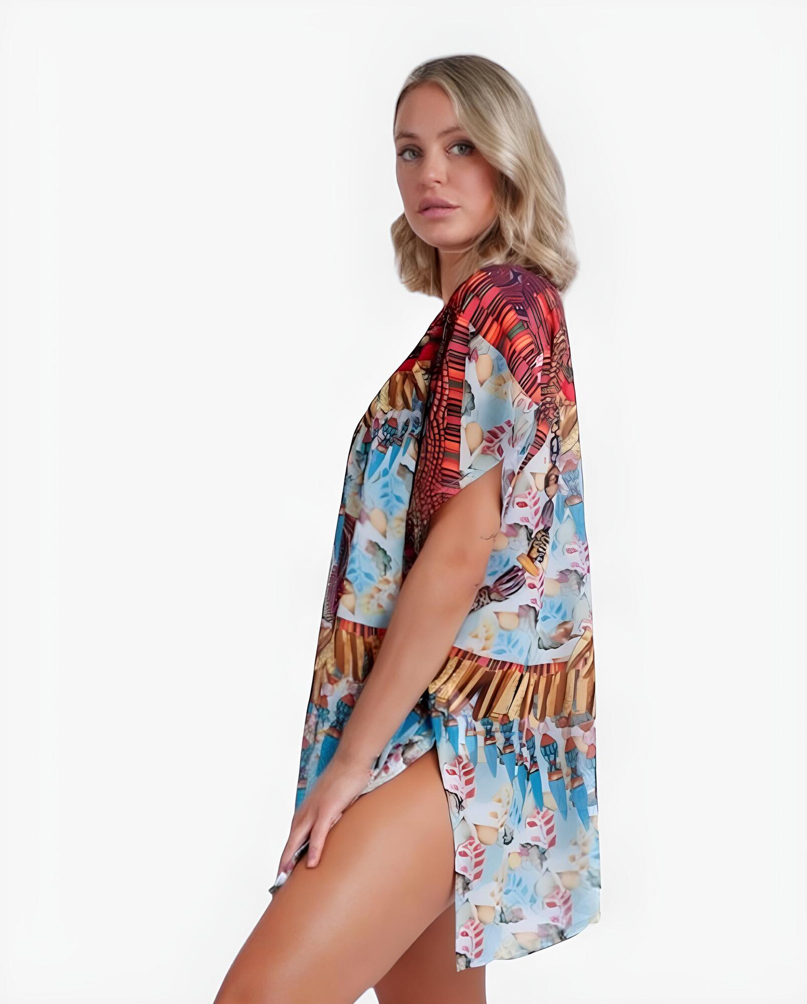 Realizzato in 100% poliestere leggero, è perfetto da indossare sopra il costume per la spiaggia o la piscina, ma anche per un aperitivo vista mare o una passeggiata sul lungomare. Un capo versatile, pratico e di grande impatto visivo, pensato per accompagnarti con stile in ogni momento delle tue giornate estive.