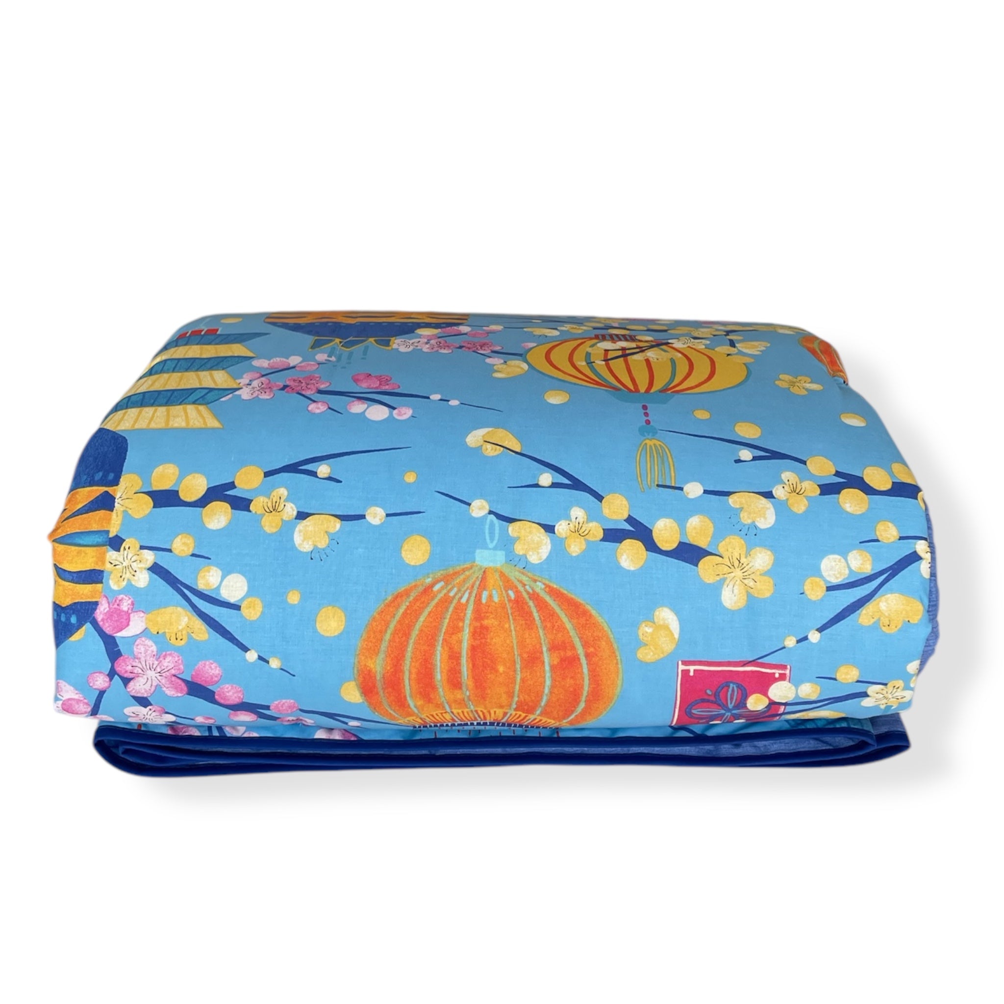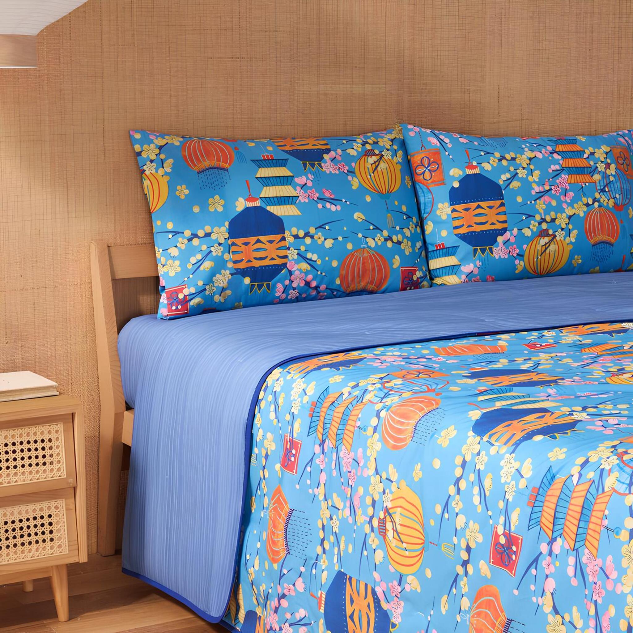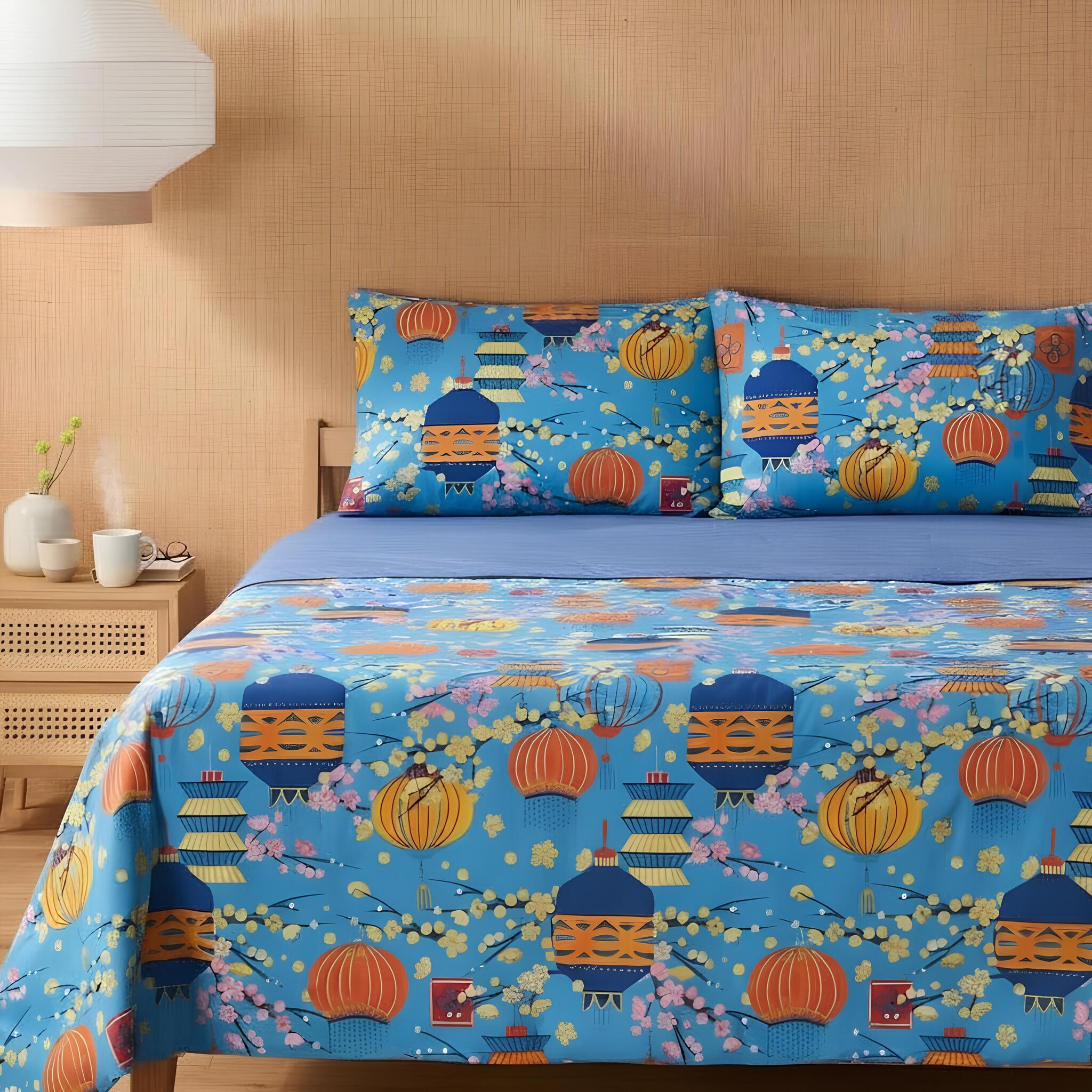 Le lanterne decorative e i toni brillanti del blu evocano un’atmosfera poetica e armoniosa, perfetta per arredare la camera con un tocco raffinato e vivace.