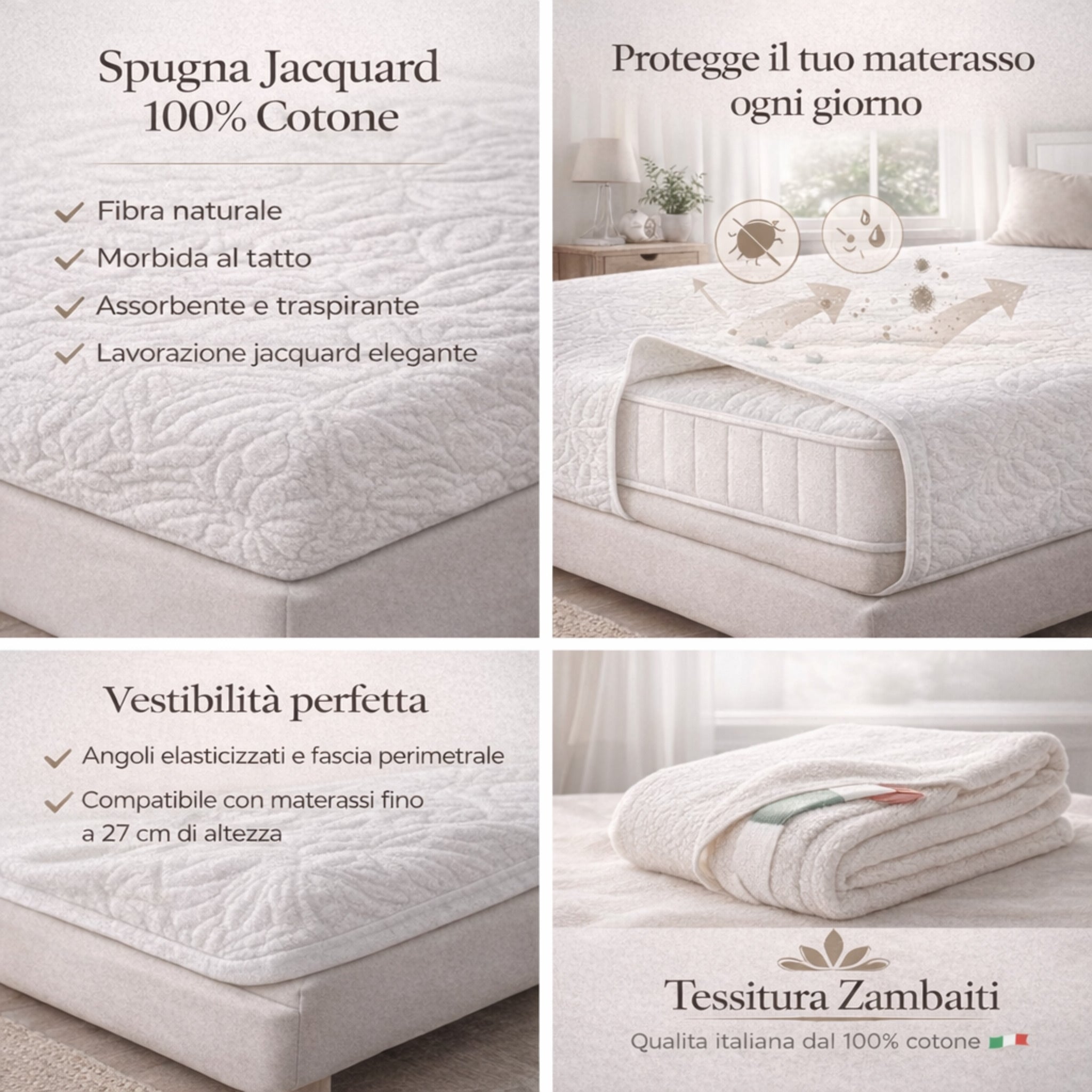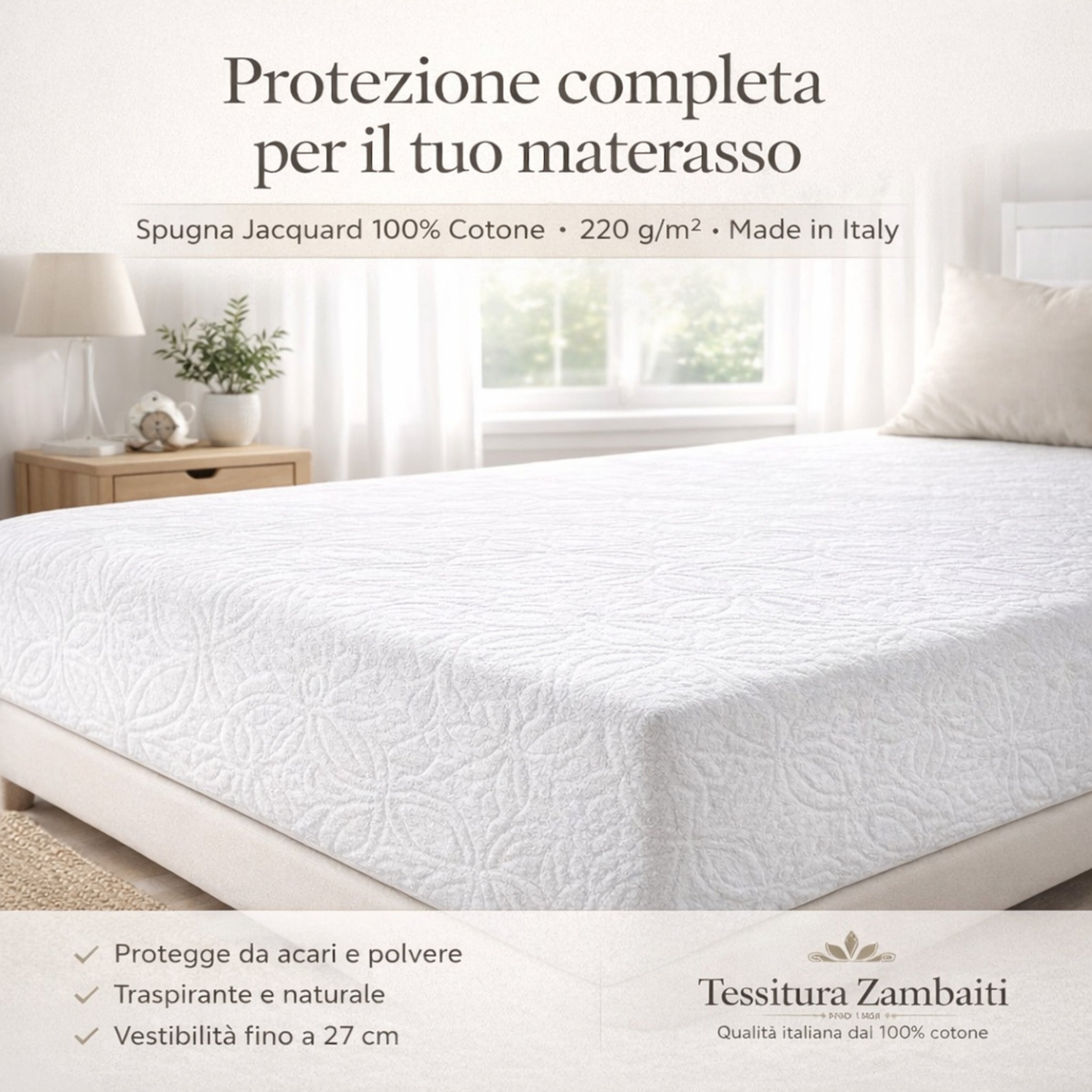 Il coprimaterasso Zambaiti LUX in spugna jacquard 100% cotone è pensato per offrire una protezione efficace e naturale al tuo materasso, senza rinunciare a comfort ed eleganza.