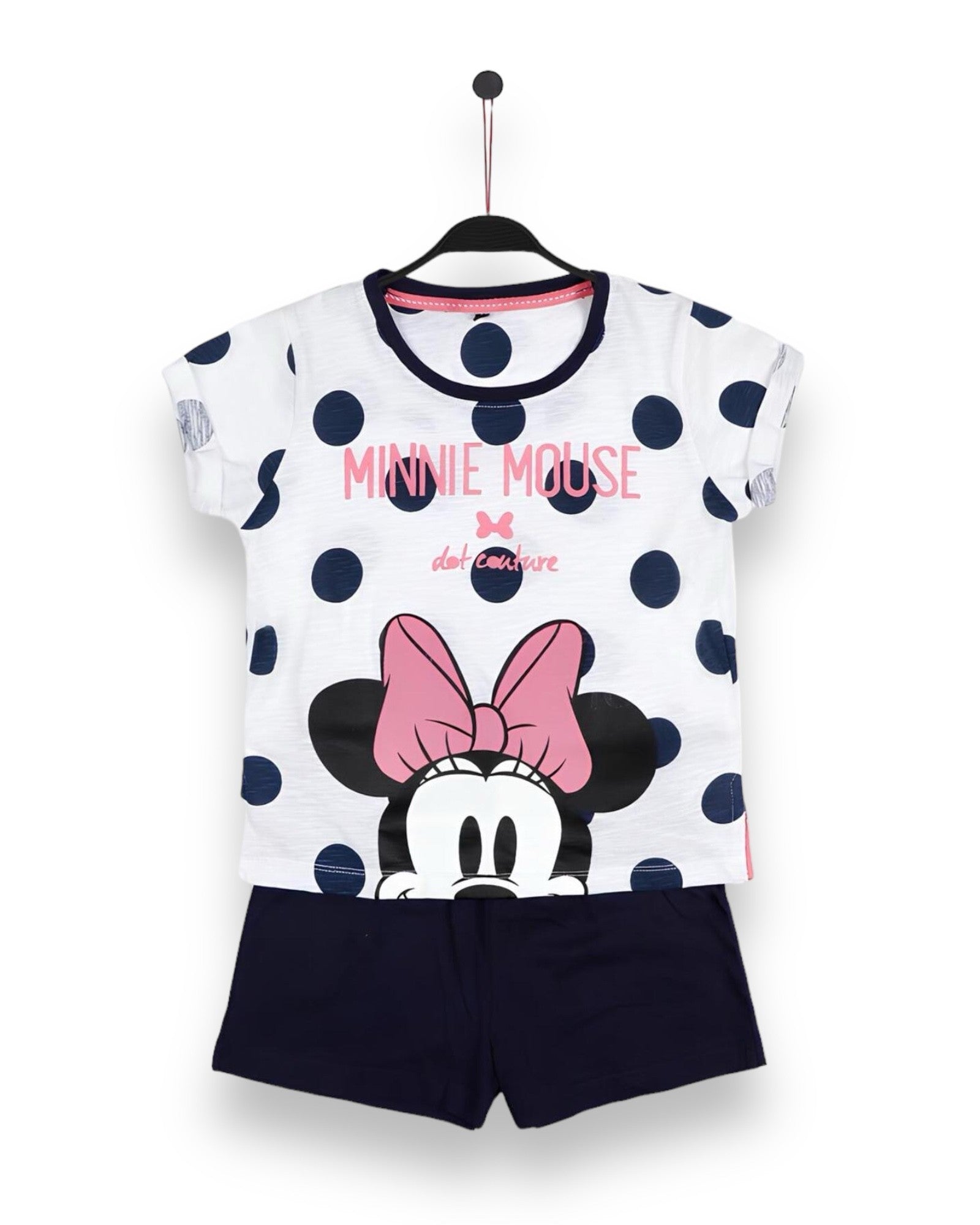 Il completo è realizzato in 100% cotone, un tessuto naturale e traspirante, ideale per la pelle delicata dei bambini. La maglia a girocollo con maniche corte è impreziosita da una dolce stampa Minnie Mouse, mentre gli shorts in tinta unita navy con elastico in vita garantiscono una vestibilità comoda e pratica.