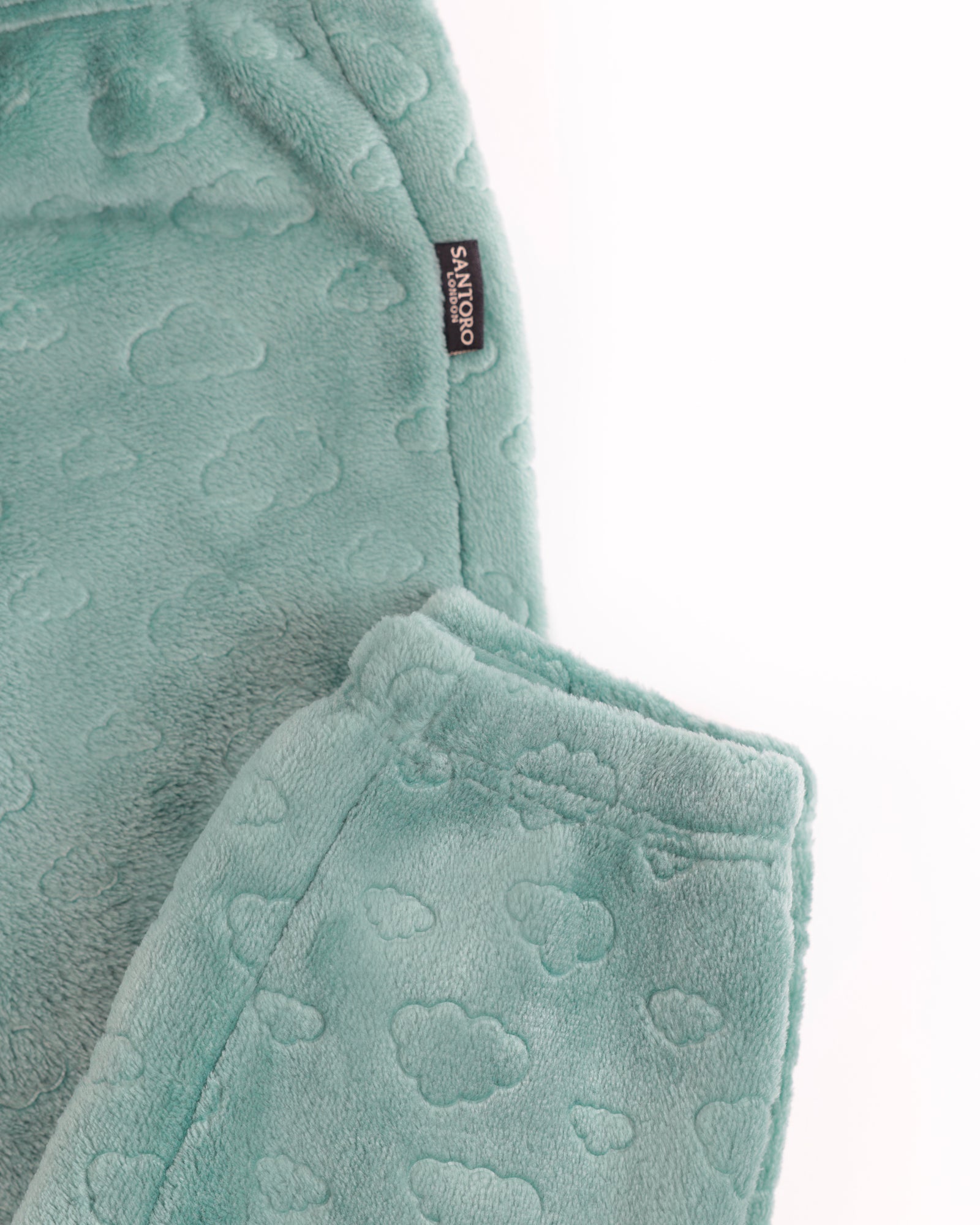 I pantaloni coordinati, con vita regolabile, sono decorati da un rilievo effetto nuvole, che aggiunge un tocco originale e raffinato.