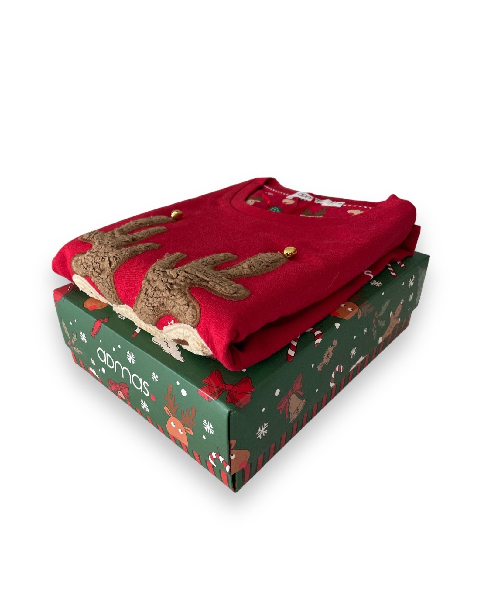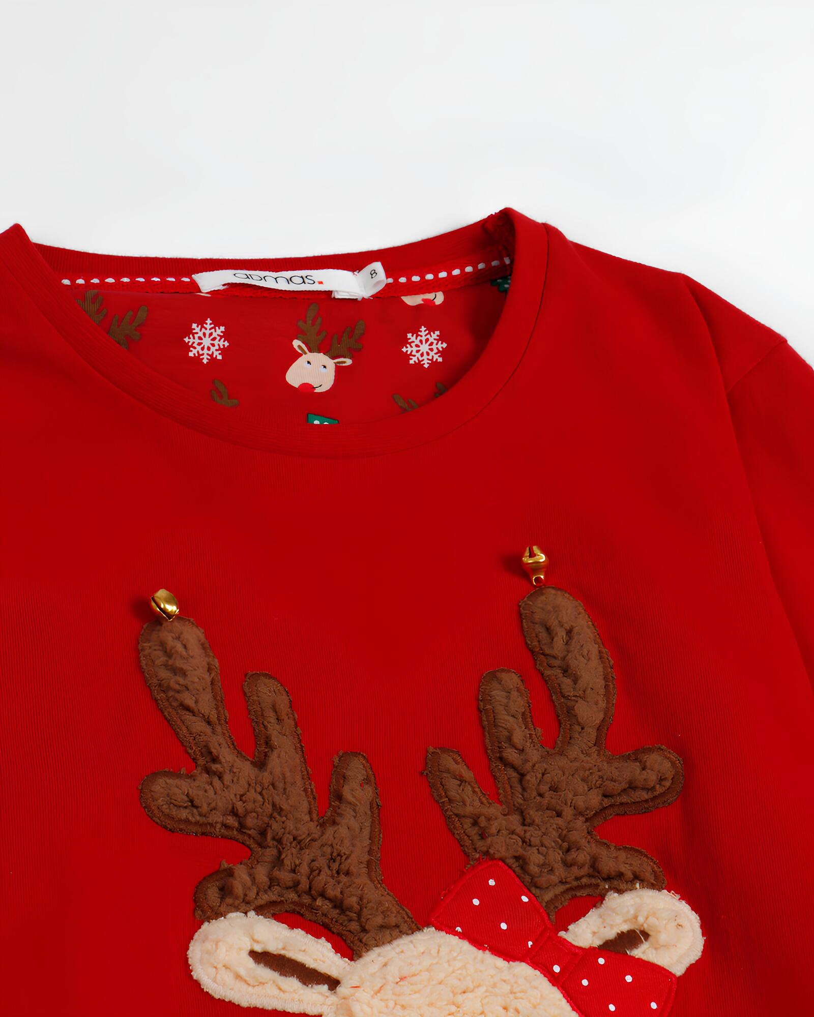 La maglia rossa girocollo a maniche lunghe presenta una dolce applicazione 3D di una renna con fiocco e campanelle tintinnanti, per un look festivo irresistibile.