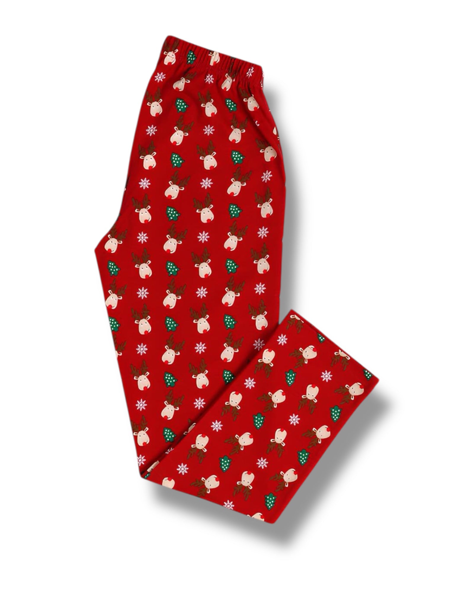 I pantaloni lunghi in cotone caldo, con stampa all-over di renne e abeti, assicurano comfort e libertà di movimento grazie alla vita elastica regolabile.
