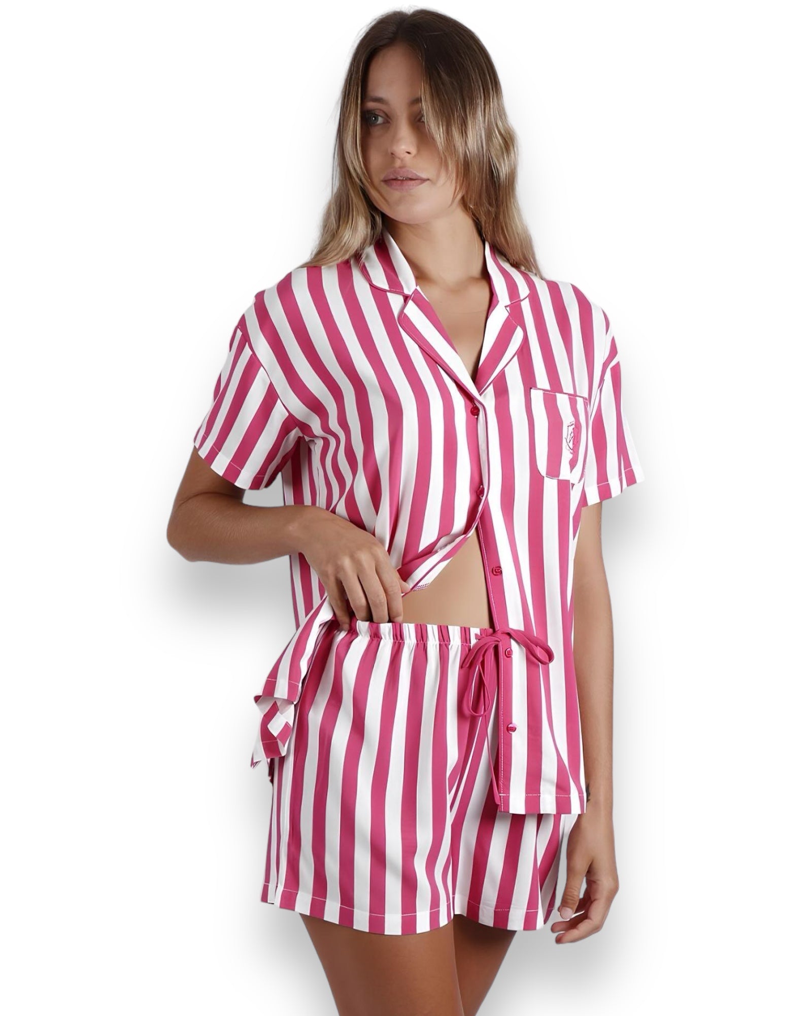 Questo pigiama Admas è sinonimo di fascino senza fine, caratterizzato da una raffinata stampa rigata verticale in finissima viscosa dal taglio classico. Tessuto fresco e morbido al tatto. Confezionato in una bellissima scatola personalizzata Admas.