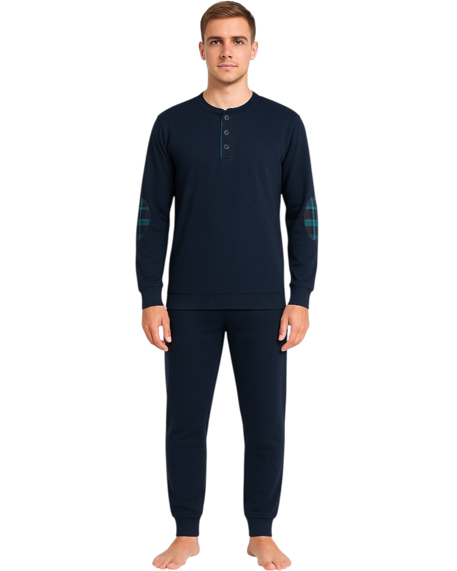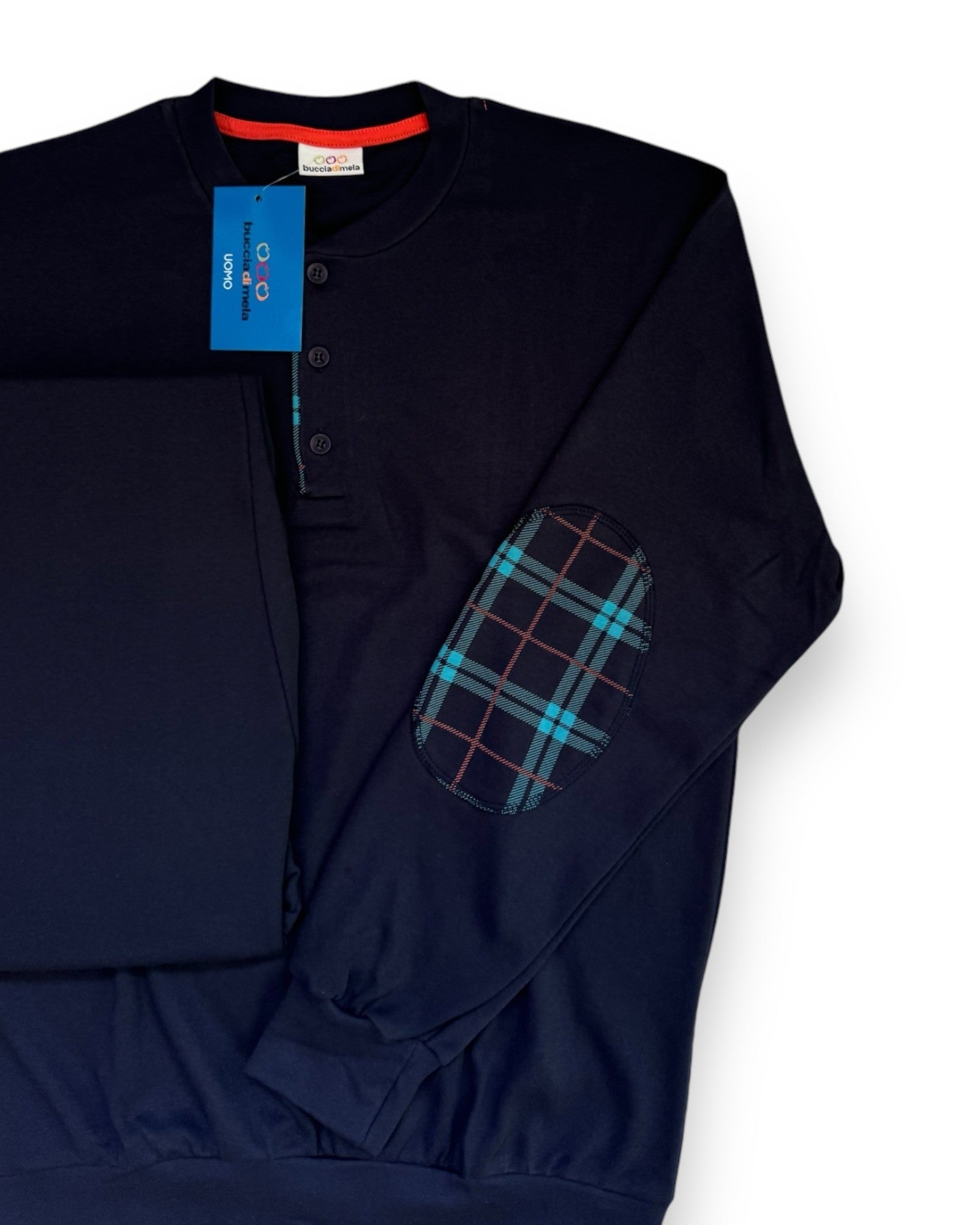 Maglia: Modello serafino girocollo a 3 bottoni in tinta unita con toppe a quadri sui gomiti, polsini elasticizzati sui polsi e fascia elasticizzata sulla circonferenza