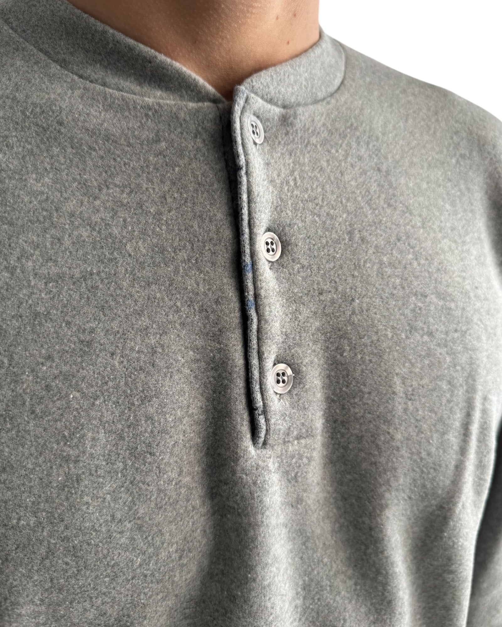 Maglia: Modello serafino girocollo a 3 bottoni in tinta unita con polsini e fascia sulla circonferenza.
