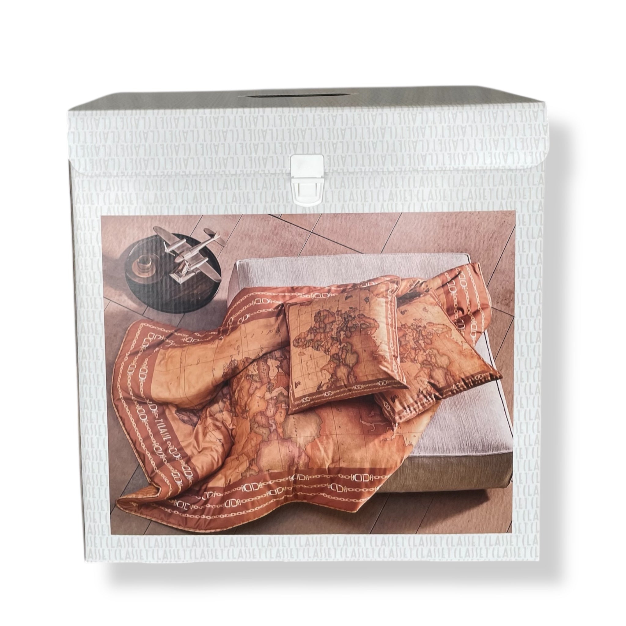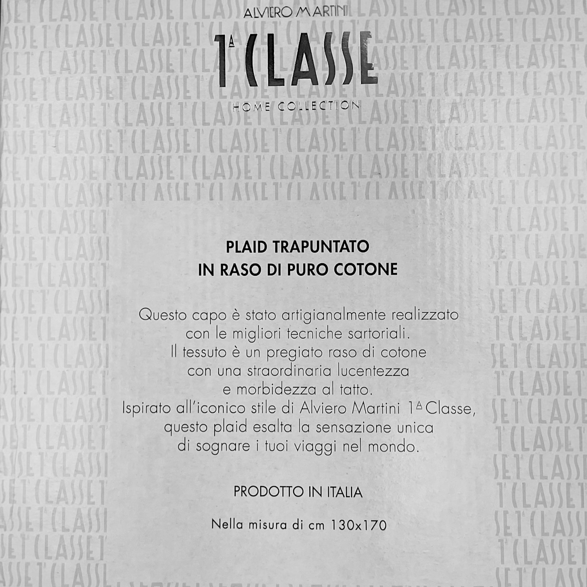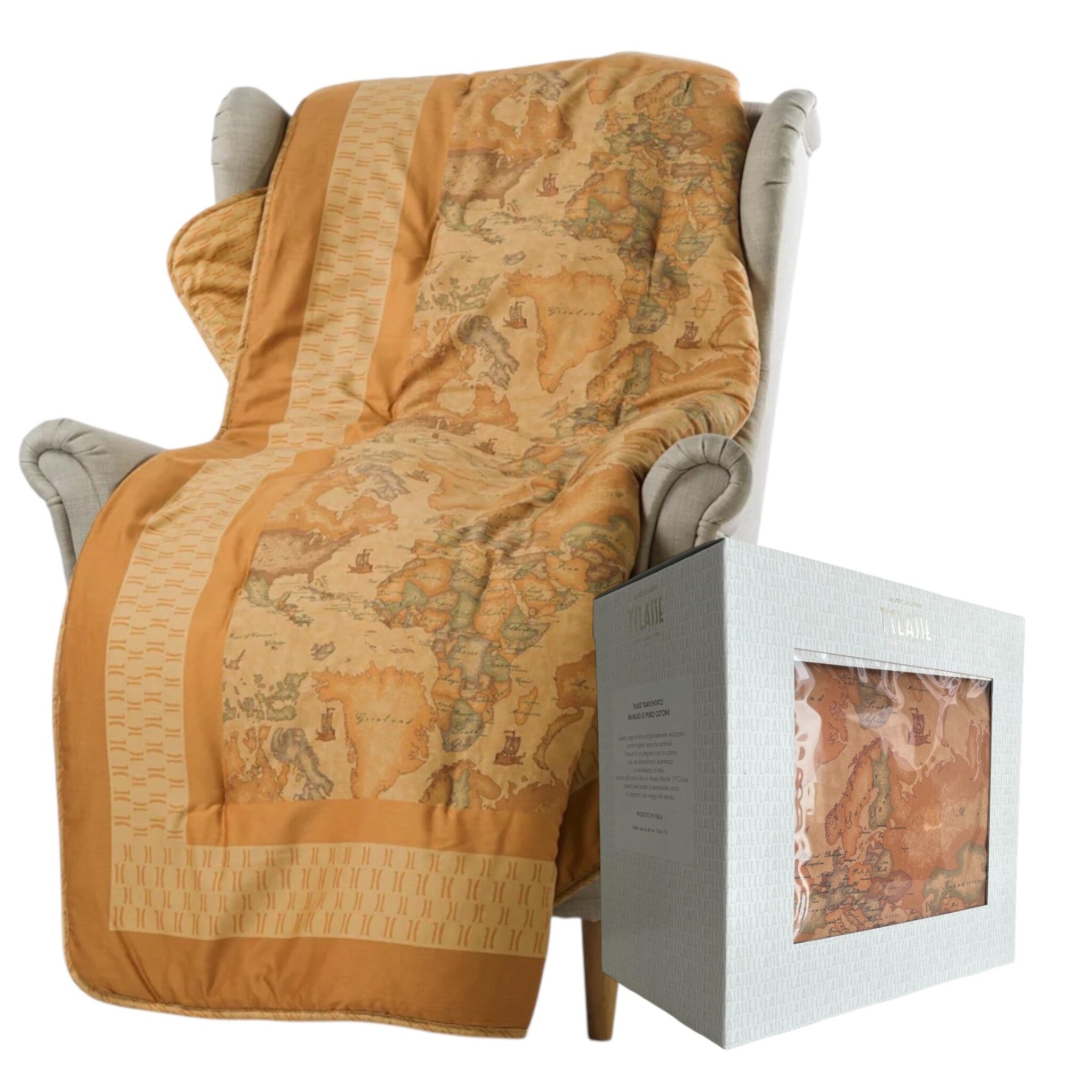 Il plaid trapuntato Geo Classic firmato Alviero Martini 1ª Classe è un vero omaggio allo stile e al comfort. Realizzato in pregiato raso di puro cotone e impreziosito da una stampa digitale doubleface ispirata al mappamondo, avvolge con la sua imbottitura calda da 150 g/m² in fibra anallergica. Un accessorio raffinato, morbido al tatto, resistente nel tempo e attento all’ambiente grazie all’uso di coloranti certificati ECO COLOR. Ideale per riscaldare le tue serate o per sorprendere con un dono elegante, viene confezionato in una splendida scatola logata, perfetta anche come idea regalo.