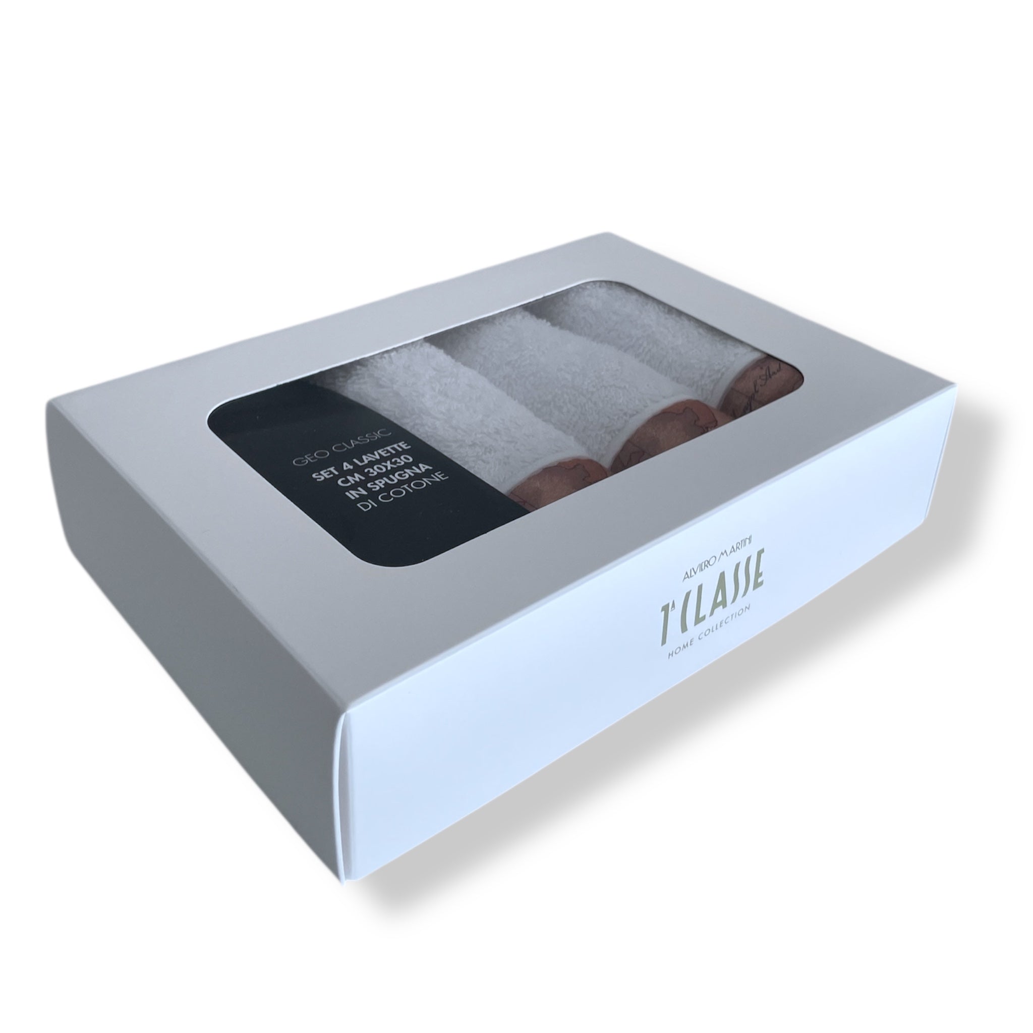 Raffinate e iconiche, le lavette Alviero Martini 1ª Classe Geo Classic uniscono l’eleganza del design italiano alla praticità quotidiana. Il set comprende 4 lavette 30x30 cm in spugna di puro cotone da 480 gr/m², altamente assorbente e morbida al tatto, con il caratteristico bordo stampato Geo Classic, simbolo distintivo del brand. Perfette per l’uso quotidiano o come idea regalo di classe, le lavette sono confezionate in un’elegante scatola stampata, disponibile nei colori Classic, Nero o Panna.