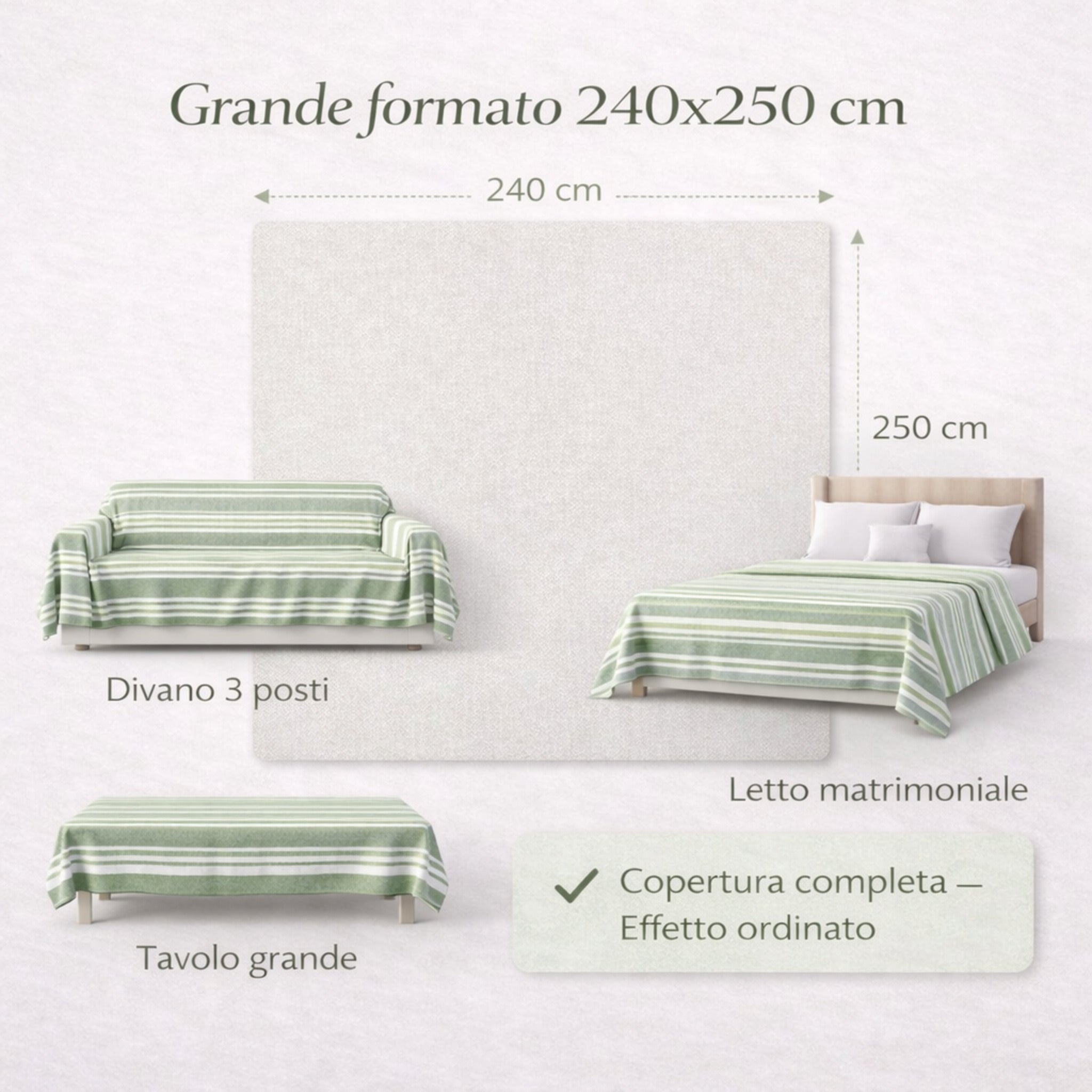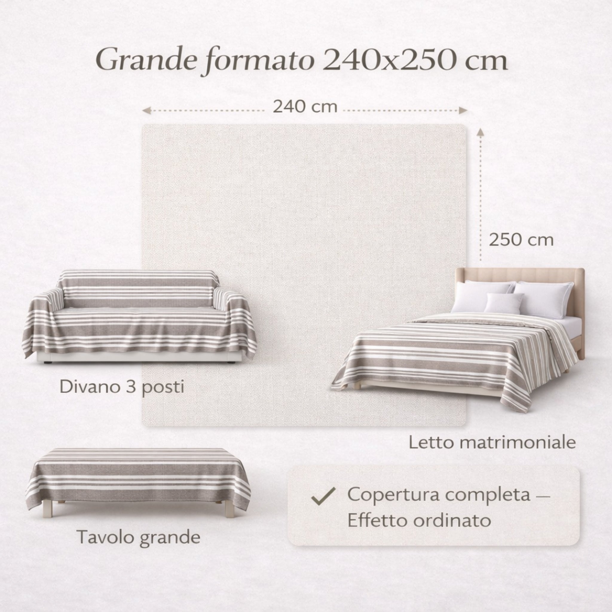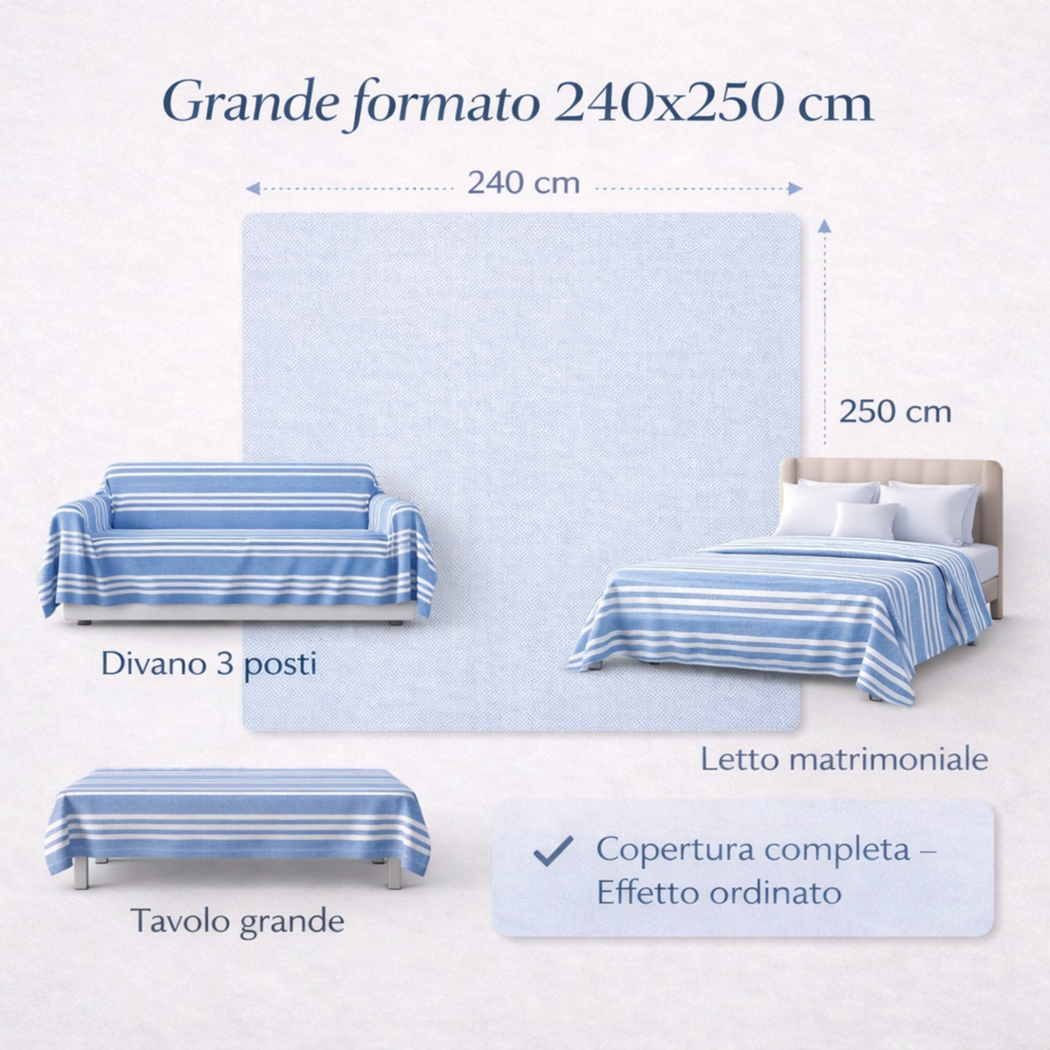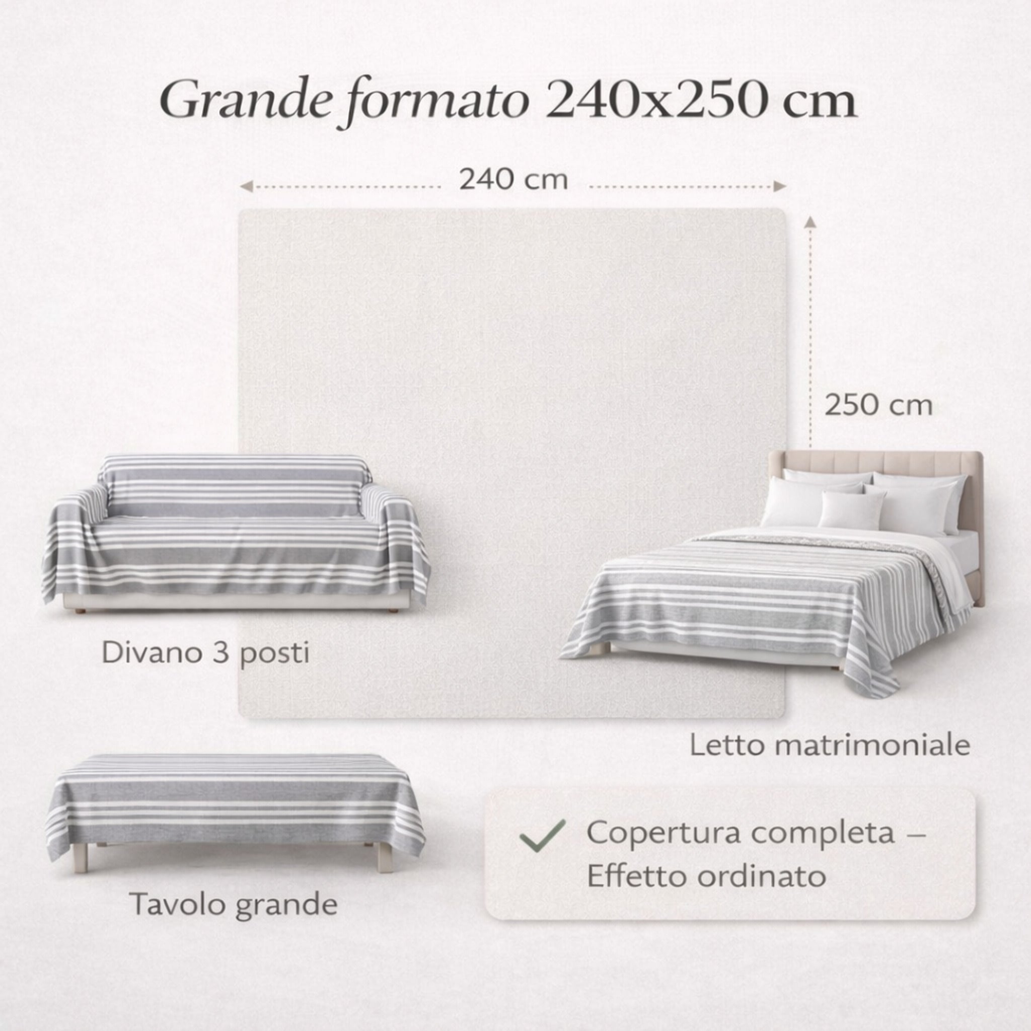 🔹 Grande formato 240x250 cm: Misura ampia ideale per coprire completamente divani a 3 posti, letti matrimoniali, tavoli grandi o per utilizzo come copritutto multiuso