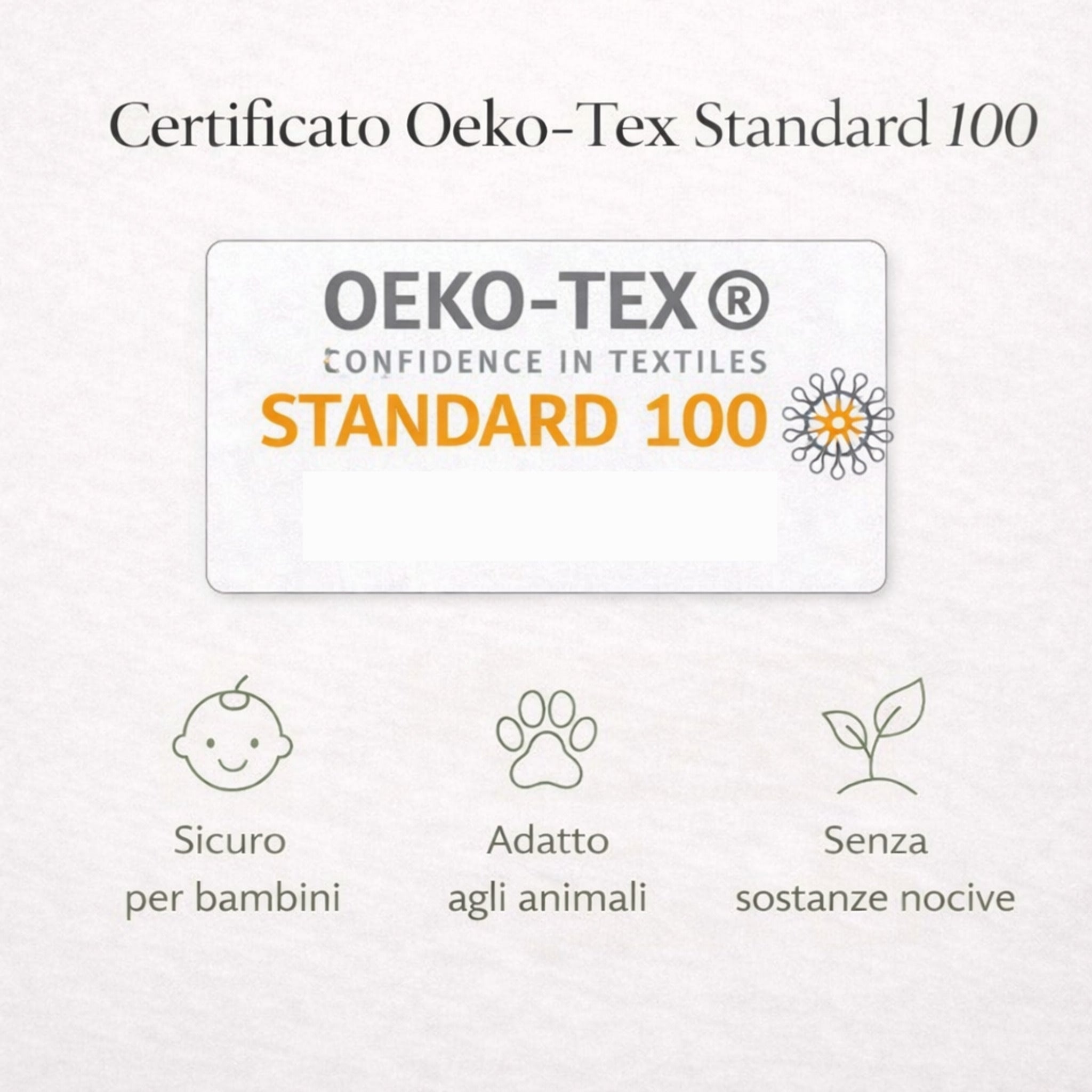 🔹 Certificazione Oeko-Tex Standard 100: Prodotto testato contro sostanze nocive, sicuro per la pelle e adatto anche a contatto diretto con bambini e animali domestici