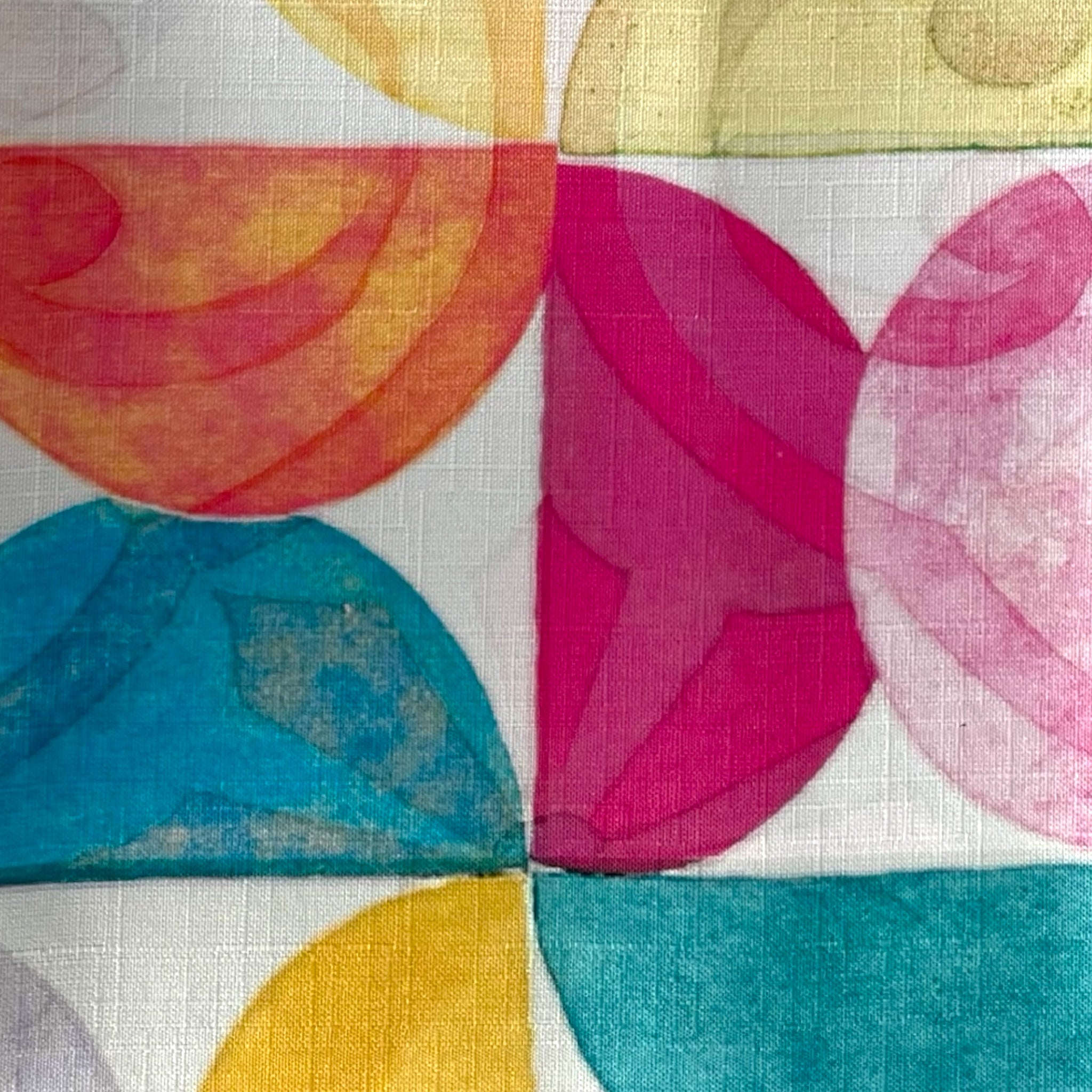 La fantasia geometrica è composta da semicerchi e forme astratte effetto acquerello nei toni del turchese, giallo sole, corallo e rosa, armoniosamente alternati su fondo chiaro. Il risultato è un design contemporaneo e luminoso, perfetto per ambienti moderni e per chi ama uno stile fresco e creativo.