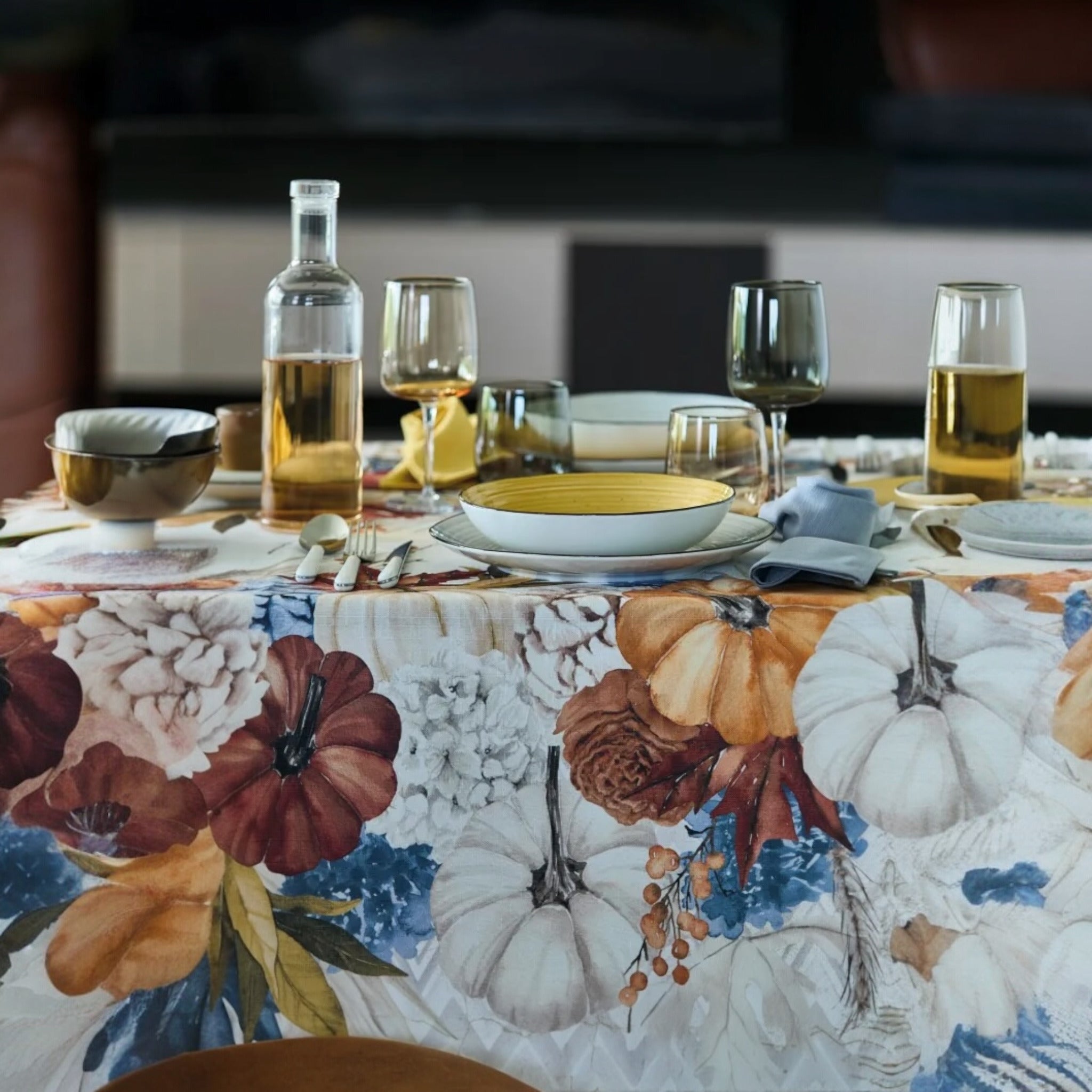 Porta in tavola l’atmosfera calda e accogliente dell’autunno con la Tovaglia Zucche di Maison Sucrée.