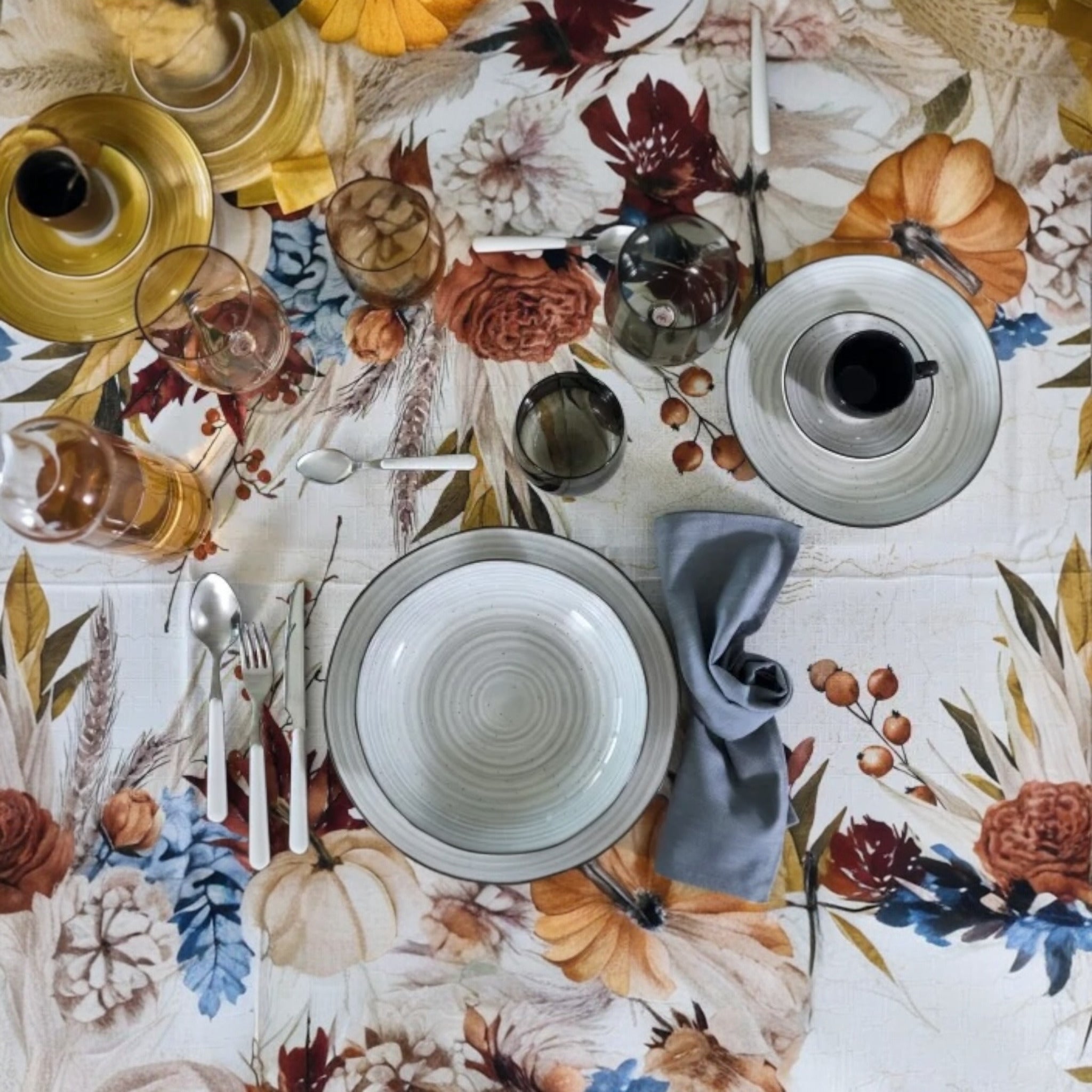 Il design autunnale con zucche, fiori e foglie nei toni caldi dell’arancio, del crema e del bordeaux dona alla tavola un tocco elegante e stagionale, ideale per cene in famiglia, pranzi di festa e decorazioni di stagione.