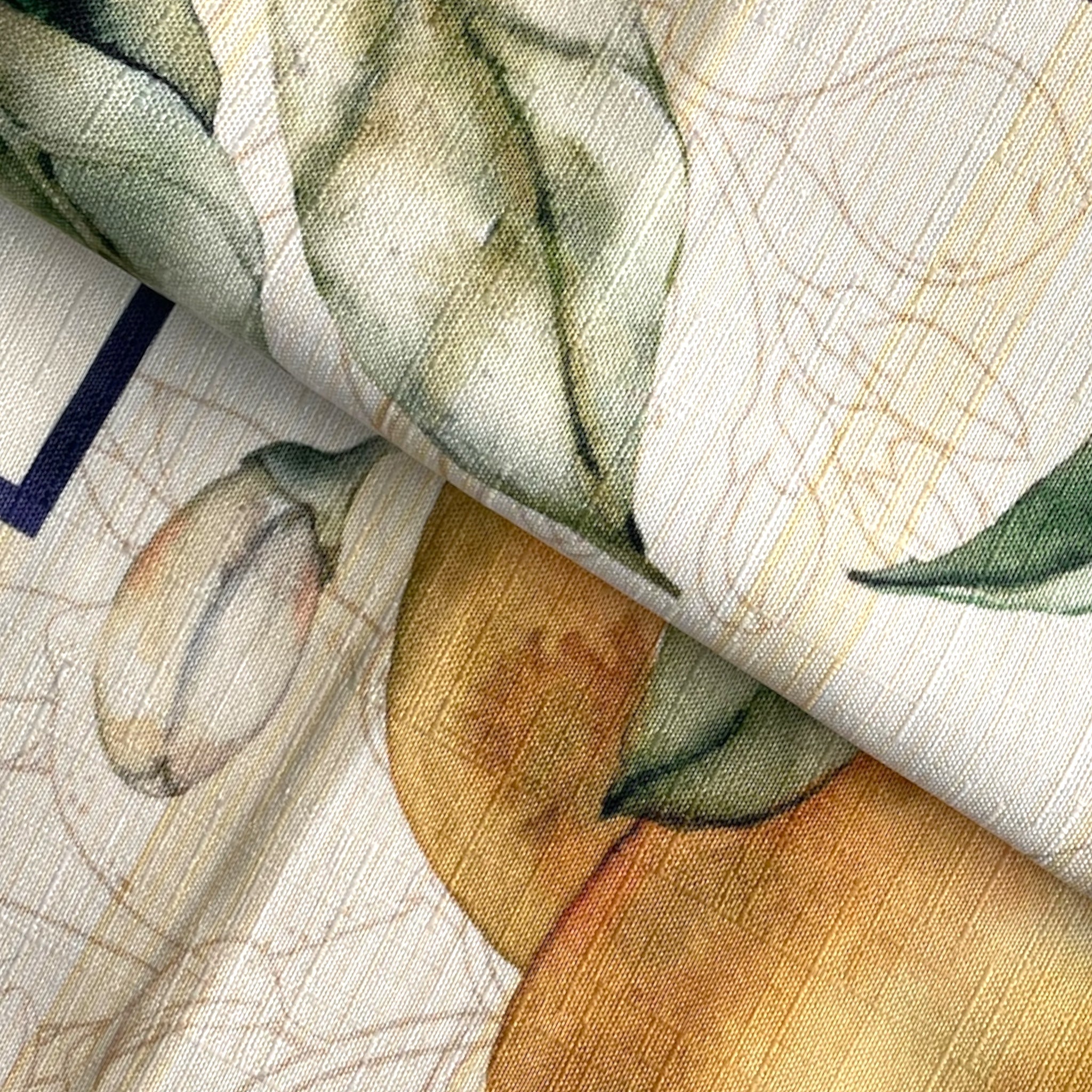 La fantasia unisce grandi fiori bianchi, foglie verdi e motivi maiolica decorativi, creando un equilibrio raffinato tra natura e tradizione. Le cornici geometriche ispirate alle ceramiche italiane donano carattere e struttura, rendendo la tavola scenografica ma armoniosa.