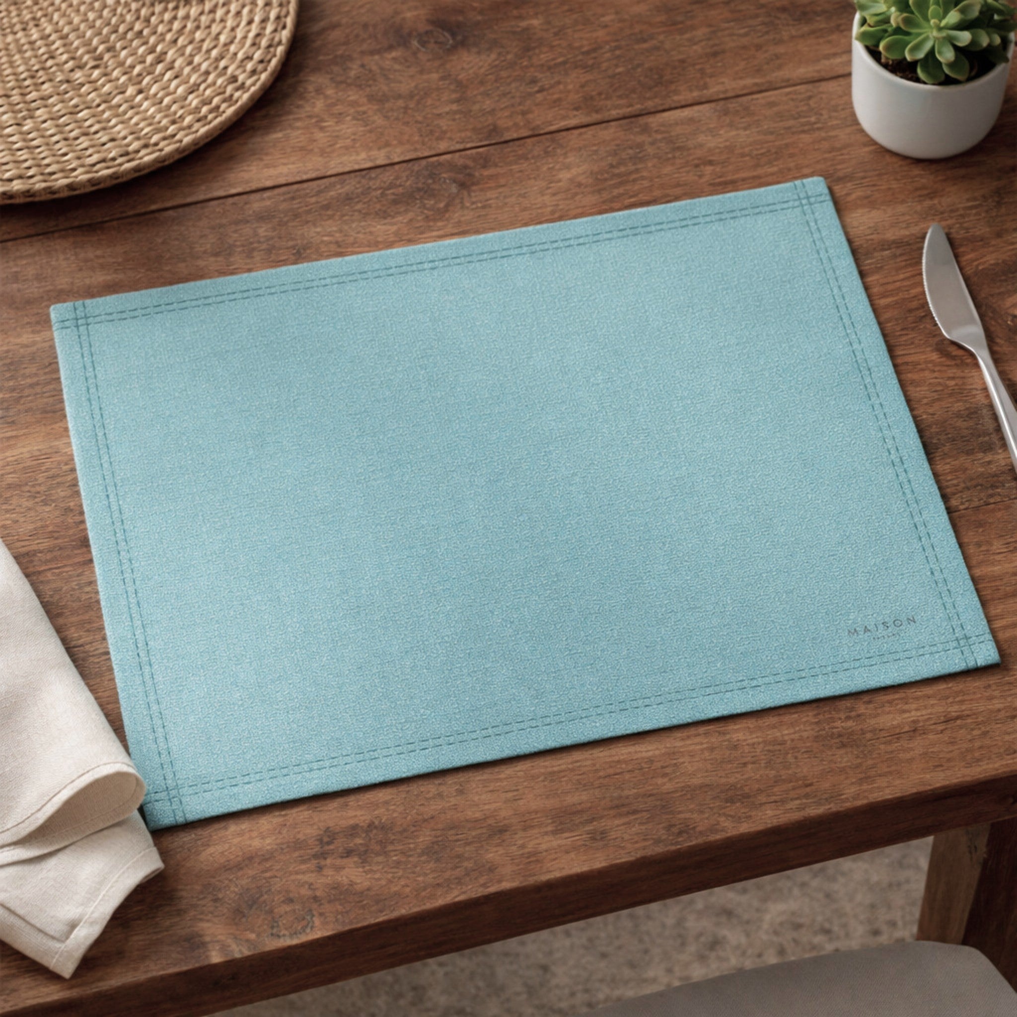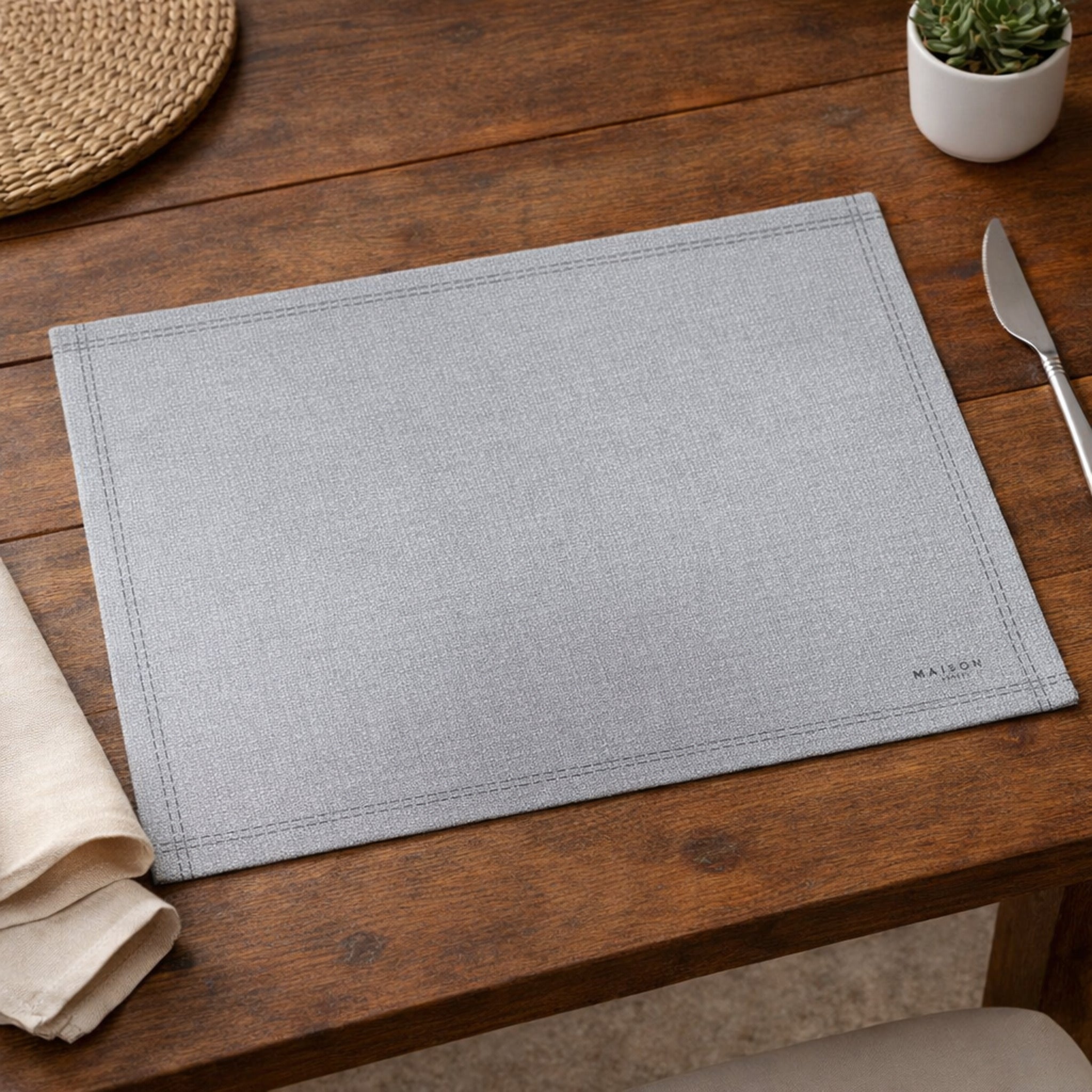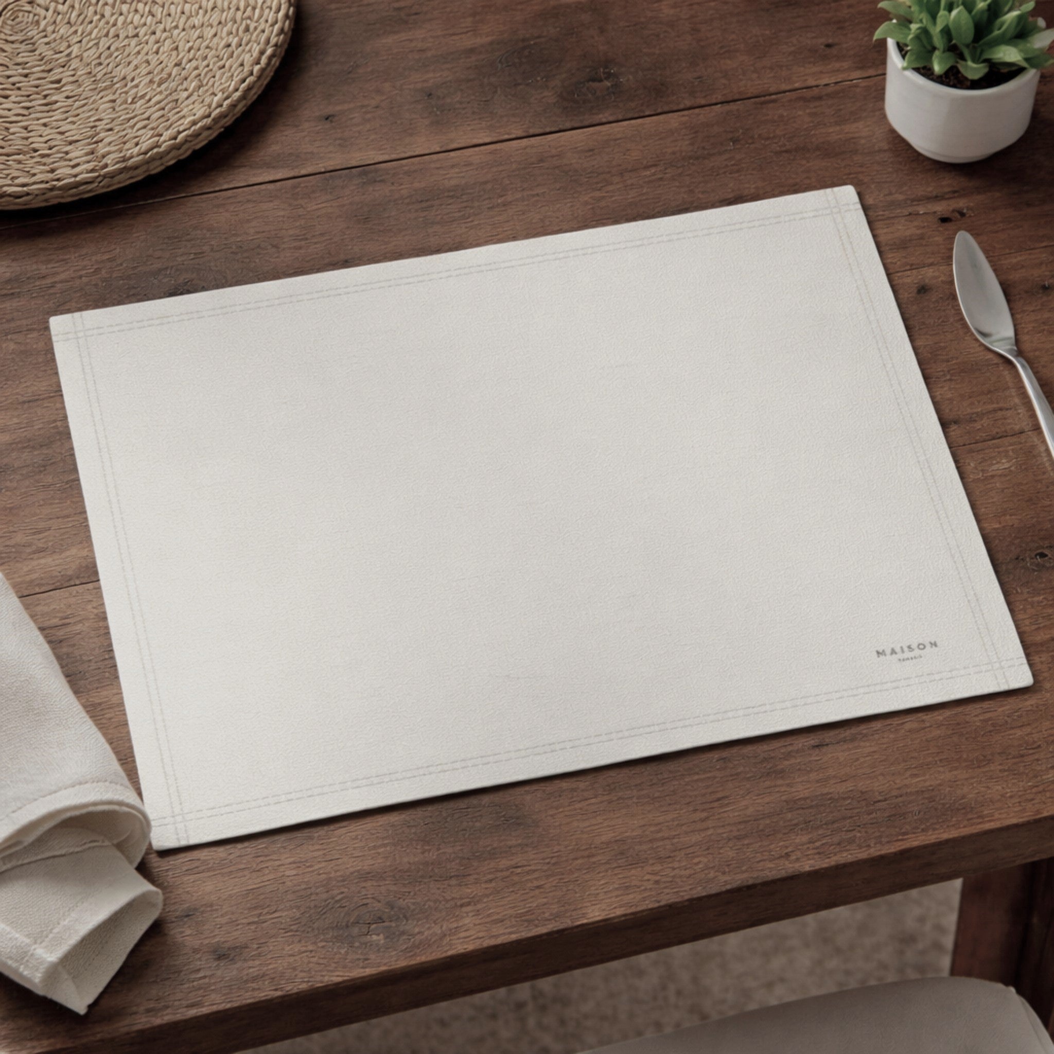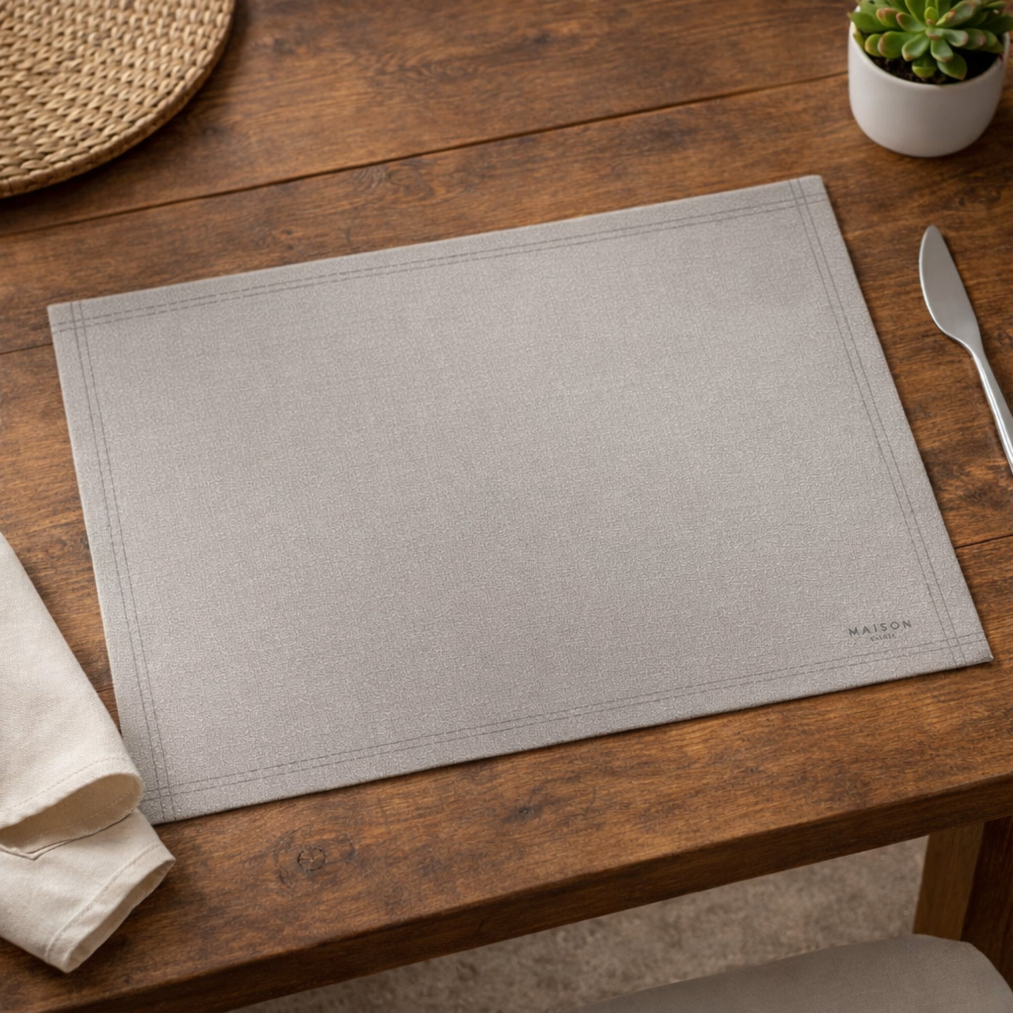 Il design tinta unita valorizza la tavola con sobrietà, mentre la texture effetto tessuto e la cornice stampata lungo il bordo donano un tocco ricercato e discreto.
