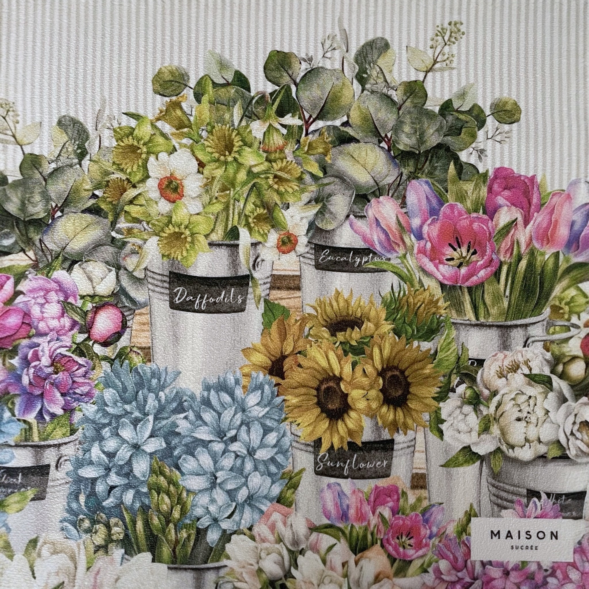 La fantasia è un’esplosione di composizioni floreali in stile botanico: tulipani, girasoli, ortensie, narcisi ed eucalipto si intrecciano in un’armonia cromatica raffinata e luminosa. Il design richiama un giardino primaverile, romantico e ricco di dettagli, perfetto per impreziosire la tavola di ogni giorno o per occasioni speciali.
