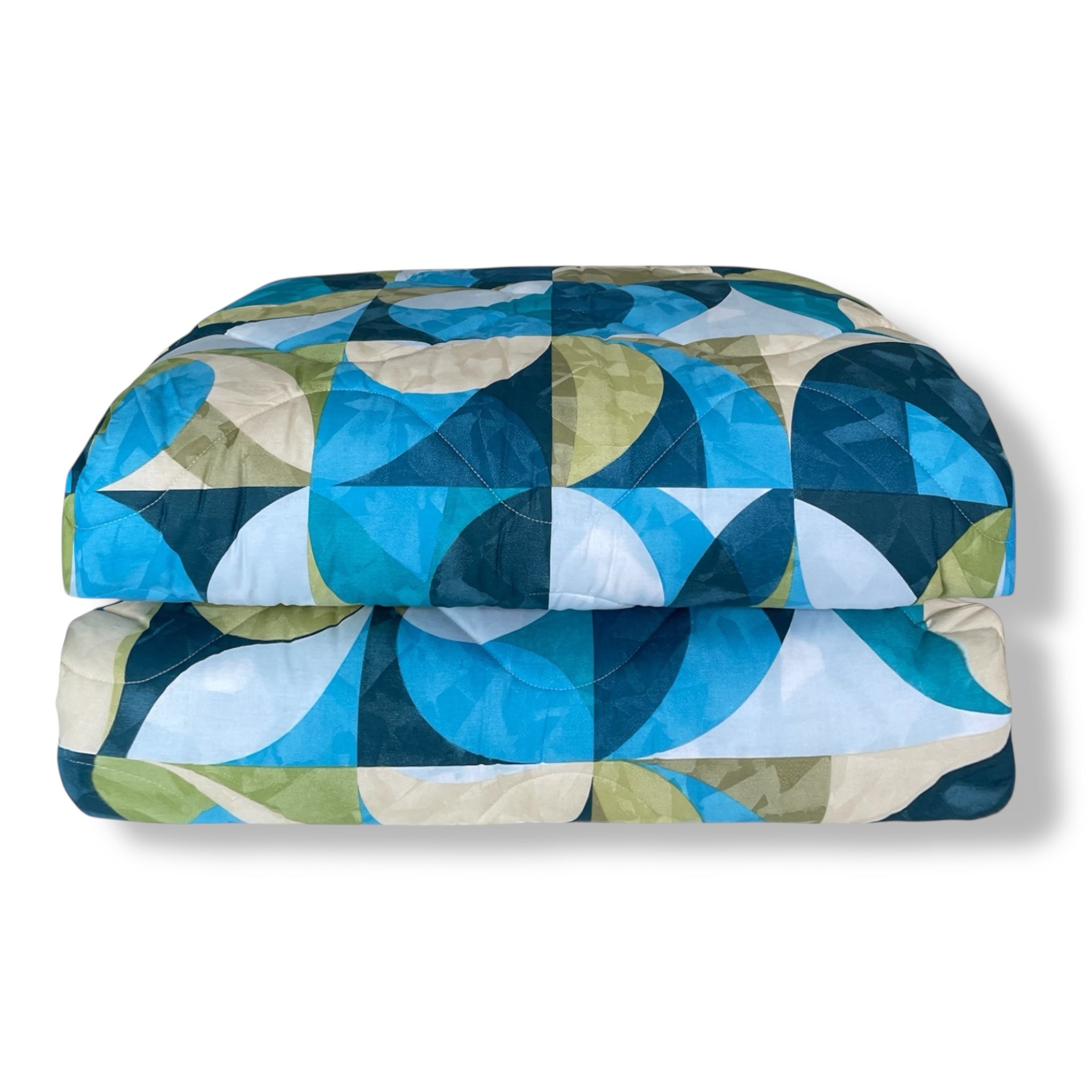La stampa digitale geometrica nei toni del blu aggiunge un tocco moderno e luminoso all’ambiente, adattandosi facilmente a ogni stile d’arredo.