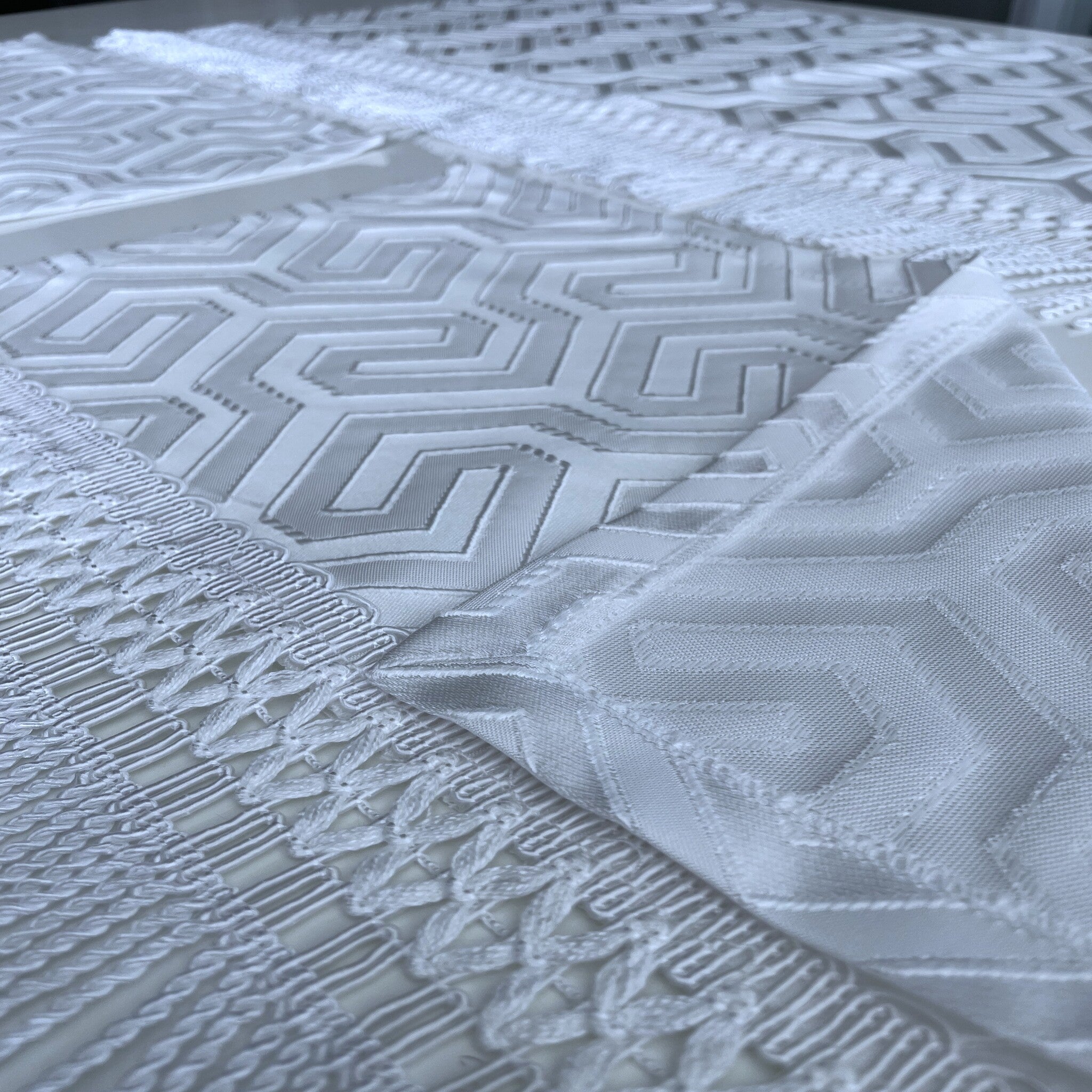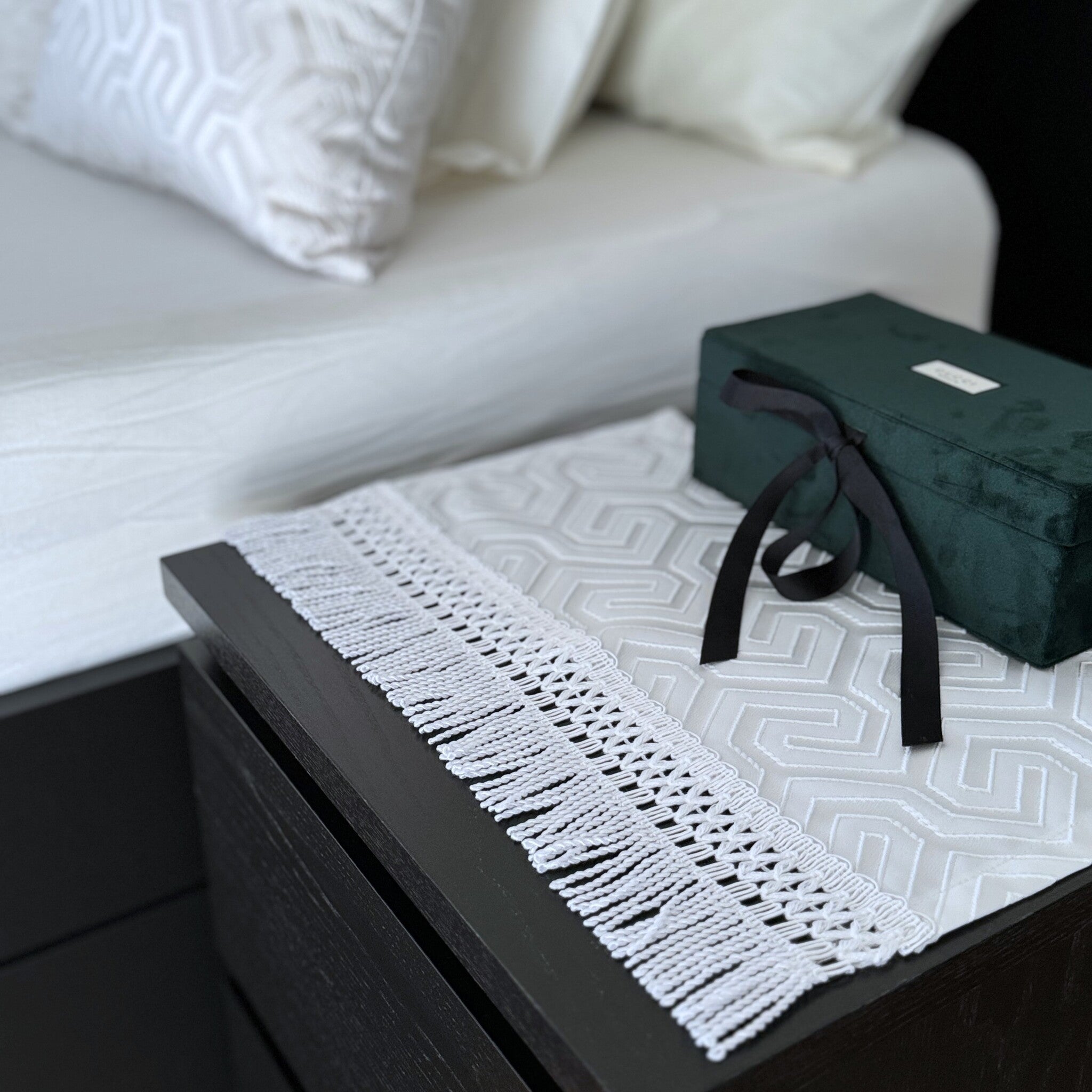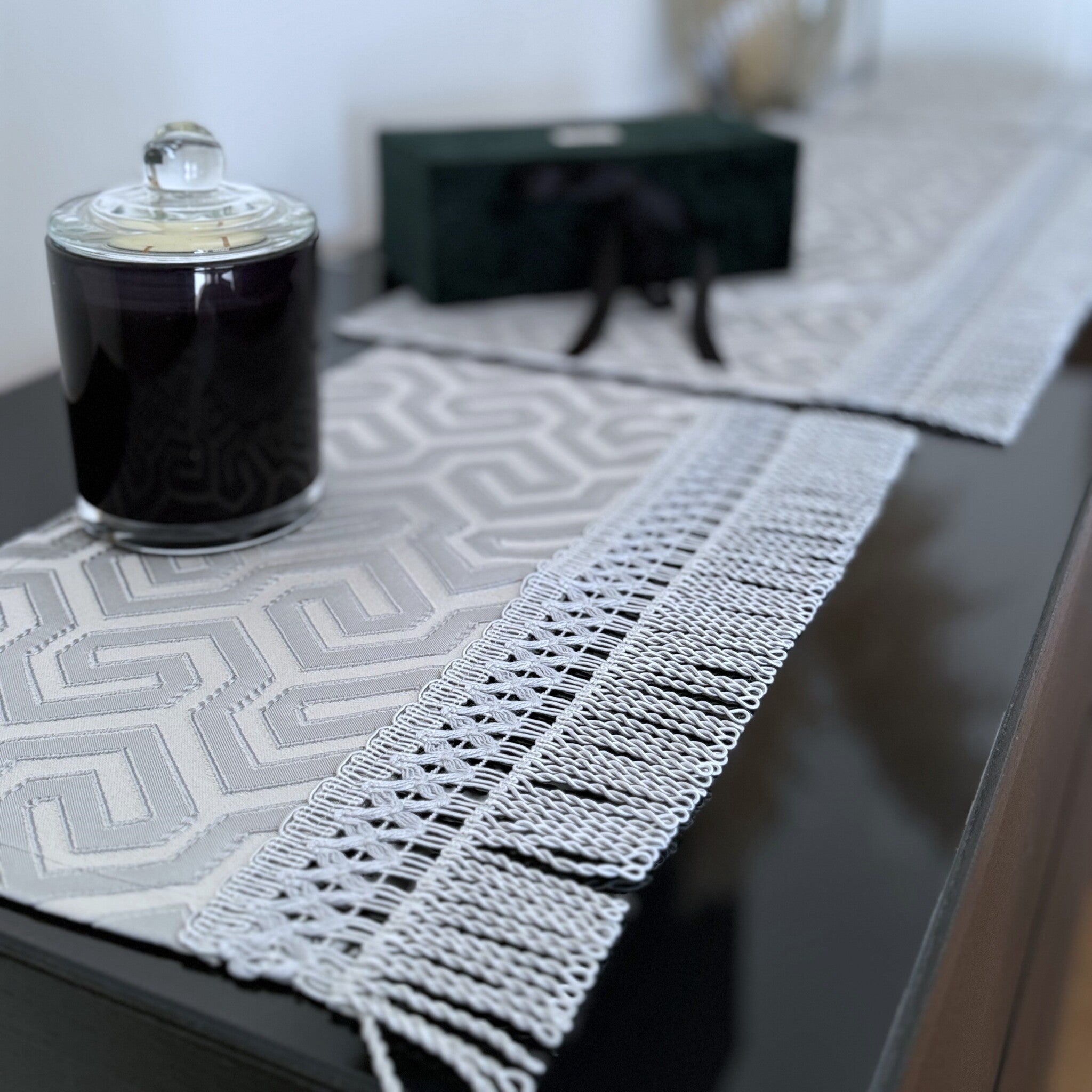 Il tris di centri con frange realizzato interamente in raso jacquard dell'azienda Bifulco Biancheria è un prodotto elegante e raffinato, ideale per dare un tocco di stile al tuo soggiorno o alla tua camera da letto. La sua trama in raso lo rende morbido al tatto e il design fantasioso con frange lo rende unico e originale