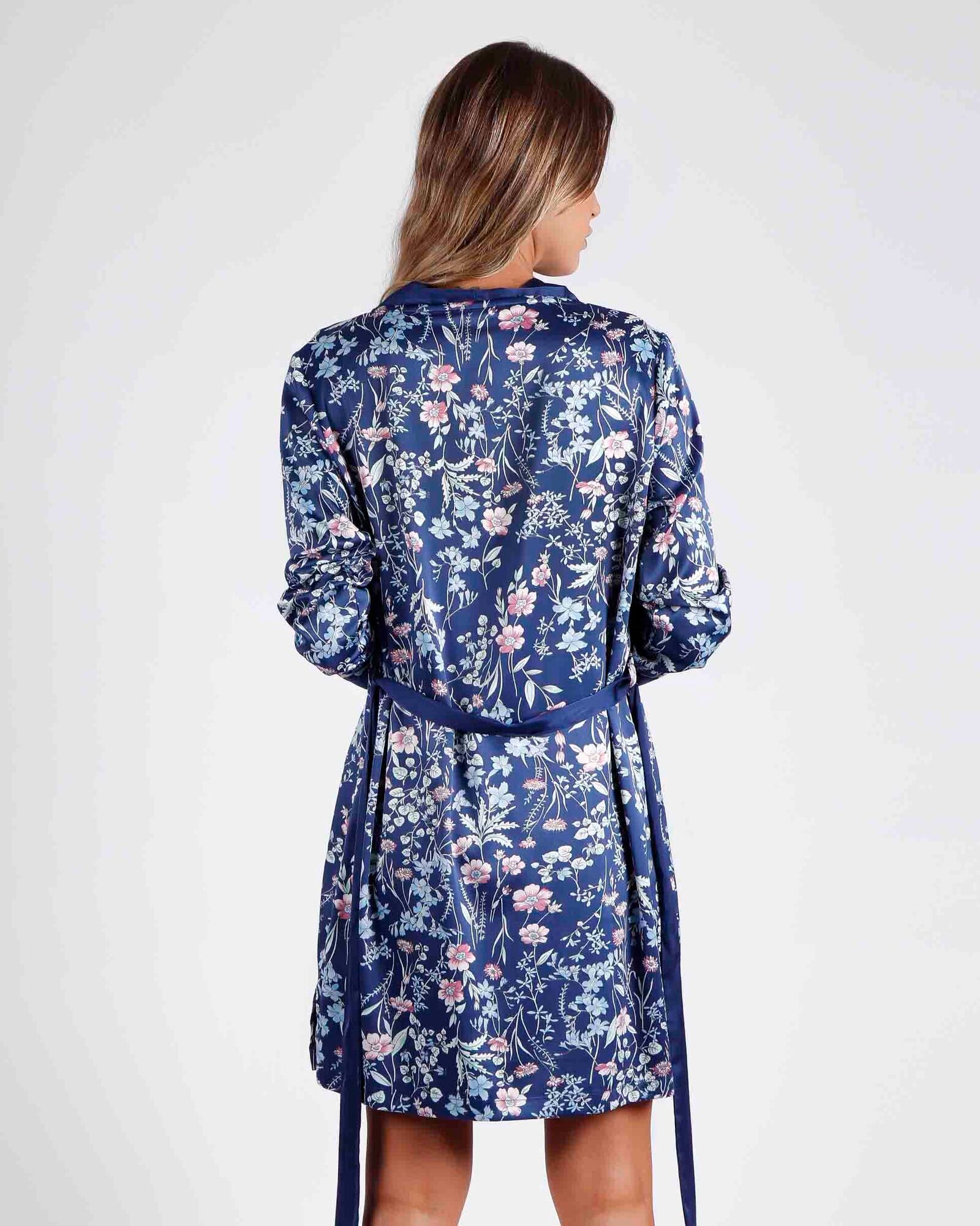 Il design a manica lunga la rende ideale per la mezza stagione e per le serate più fresche, mentre il colore navy, profondo e sofisticato, esalta la stampa fiorata donando un aspetto curato e senza tempo. Il tessuto è morbido al tatto, leggero e piacevole da indossare.